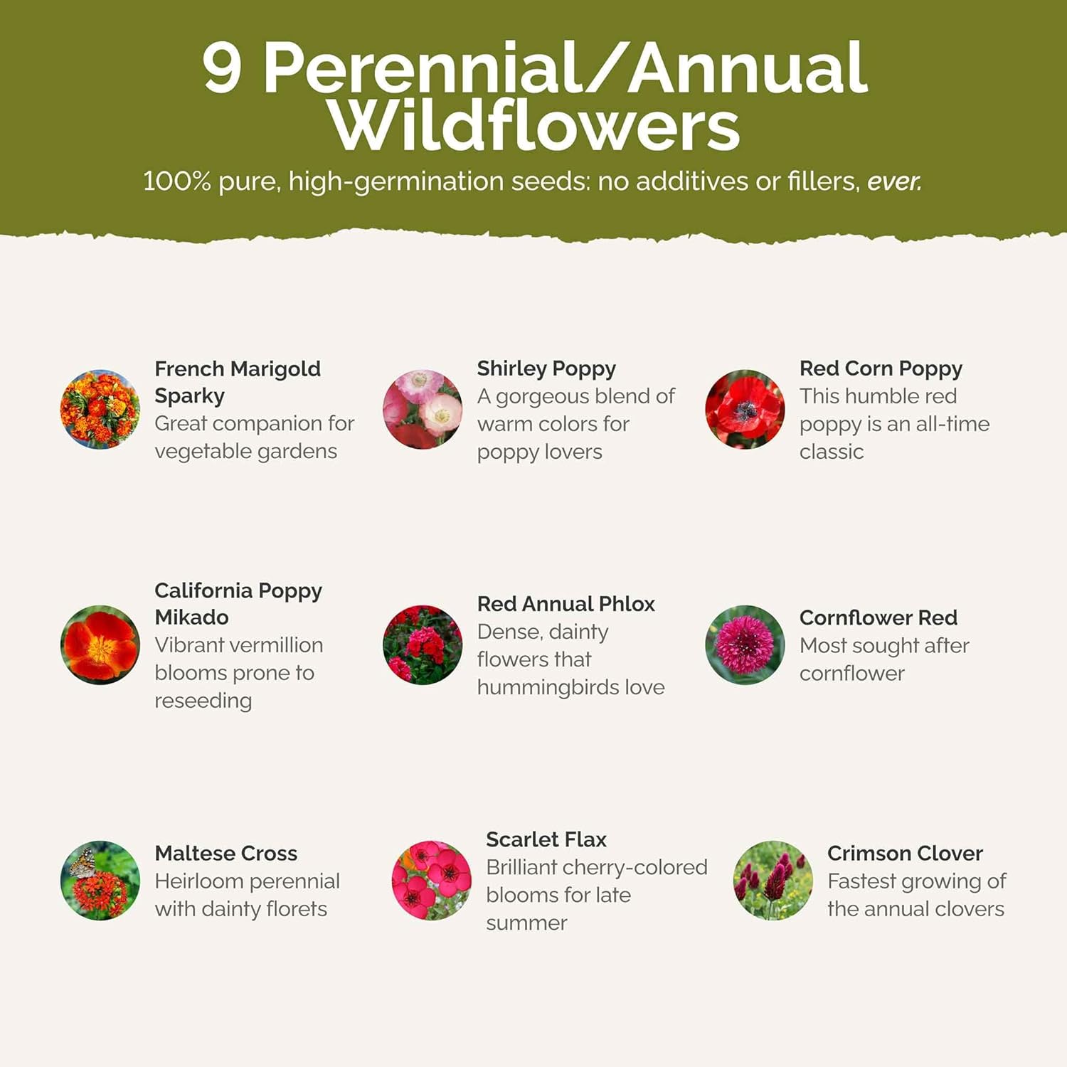 - 100% Pure, Non-GMO Seeds - No fillers, favorites only! Includes 10 easy-to-grow species: French Marigold Sparky, Red Mixed Shirley, California Mikado, Annual Phlox Red, Love Lies Bleeding, Maltese Cross, Scarlet Flax, Bloodflower