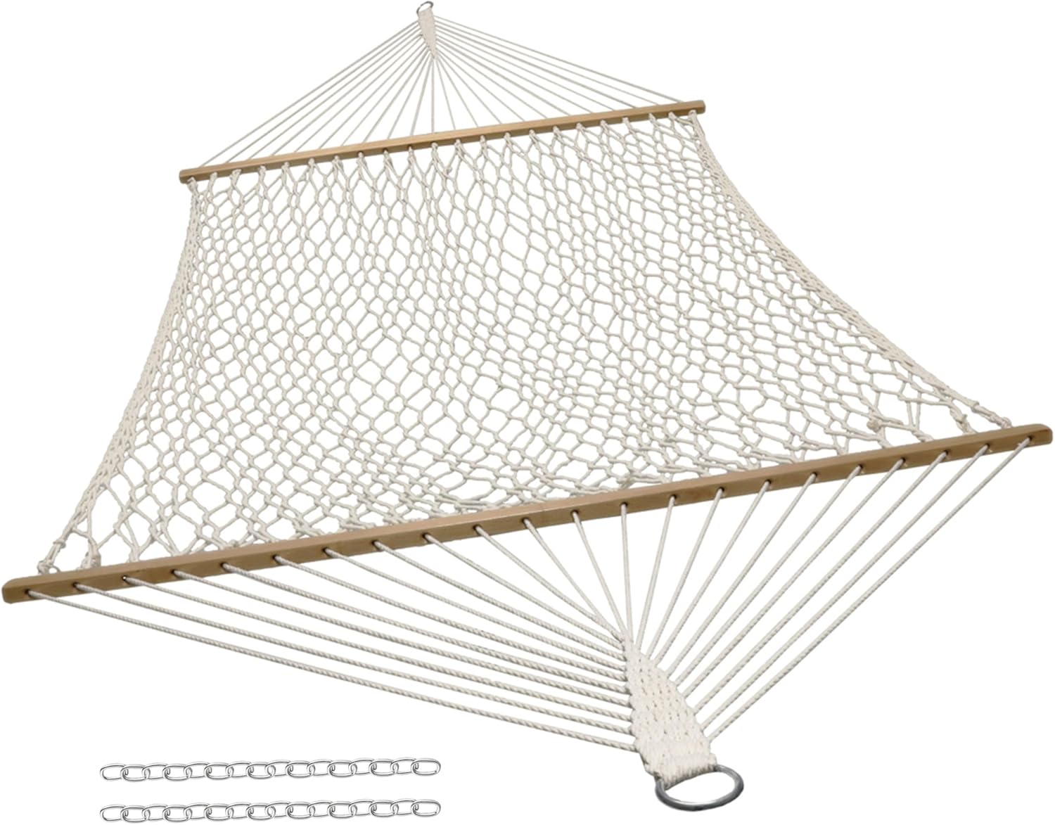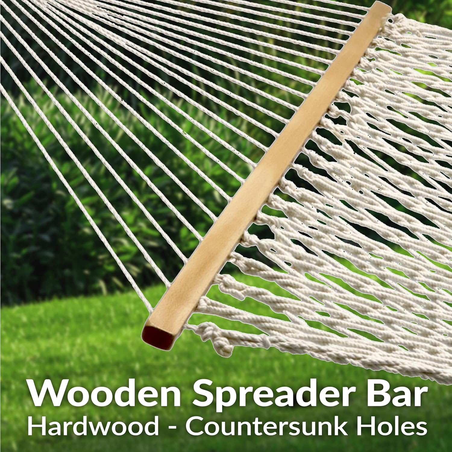 - CLASSIC AND DURABLE: This double hammock with spreader bar is made from a soft 65% cotton and 35% polyester rope material and features classic hardwood spreader bars for added style, comfort, and relaxation.