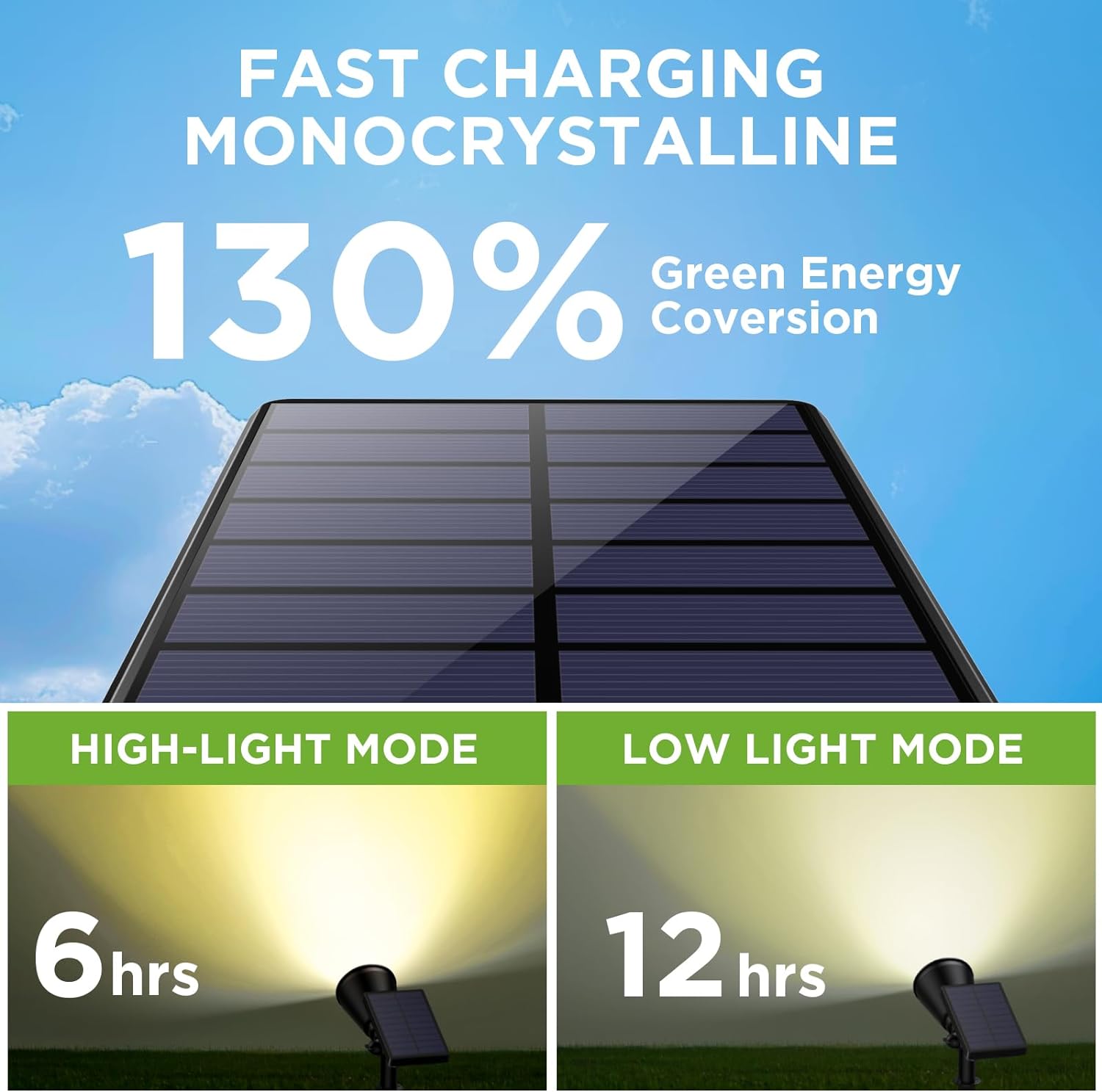 - Improved Brightness & 2 Working Modes: With super brightness, this solar spotlight can cast a focused ray to highlight your flagpole or beautiful sculpture, even on the darkest of nights. You have the option to set from High Mode (MAX 6Hrs) to Low Mode (MAX 12Hrs) to extend working time.