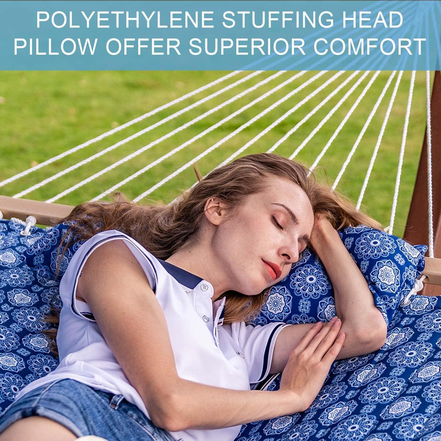- SUPER COMFY: The double-layered quilted polyester with inner polyester padding and a polyethylene stuffing head pillow offer superior comfort. This quilted hammock can give you a cloud-like comfortable experience. Lying on it is like being in a warm embrace. No matter it's in summer or winter, this hammock will always be your first choice for relaxation.