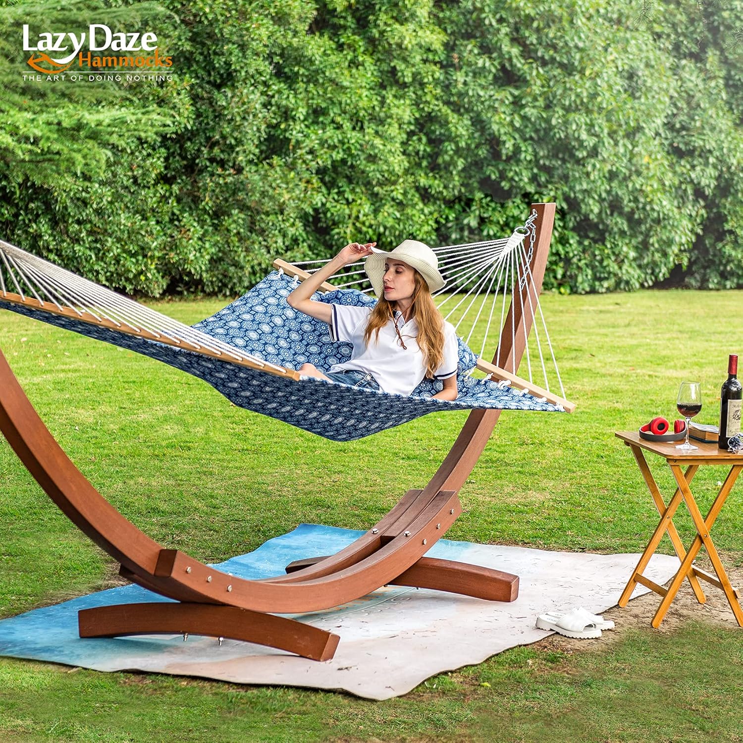 Lazy Daze Hammocks 12 FT Double Quilted Fabric Hammock with Spreader Bars and Detachable Pillow, 2 Person Hammock for Outdoor Patio Backyard Poolside, 450 LBS Weight Capacity, Blue Floral,HM003648