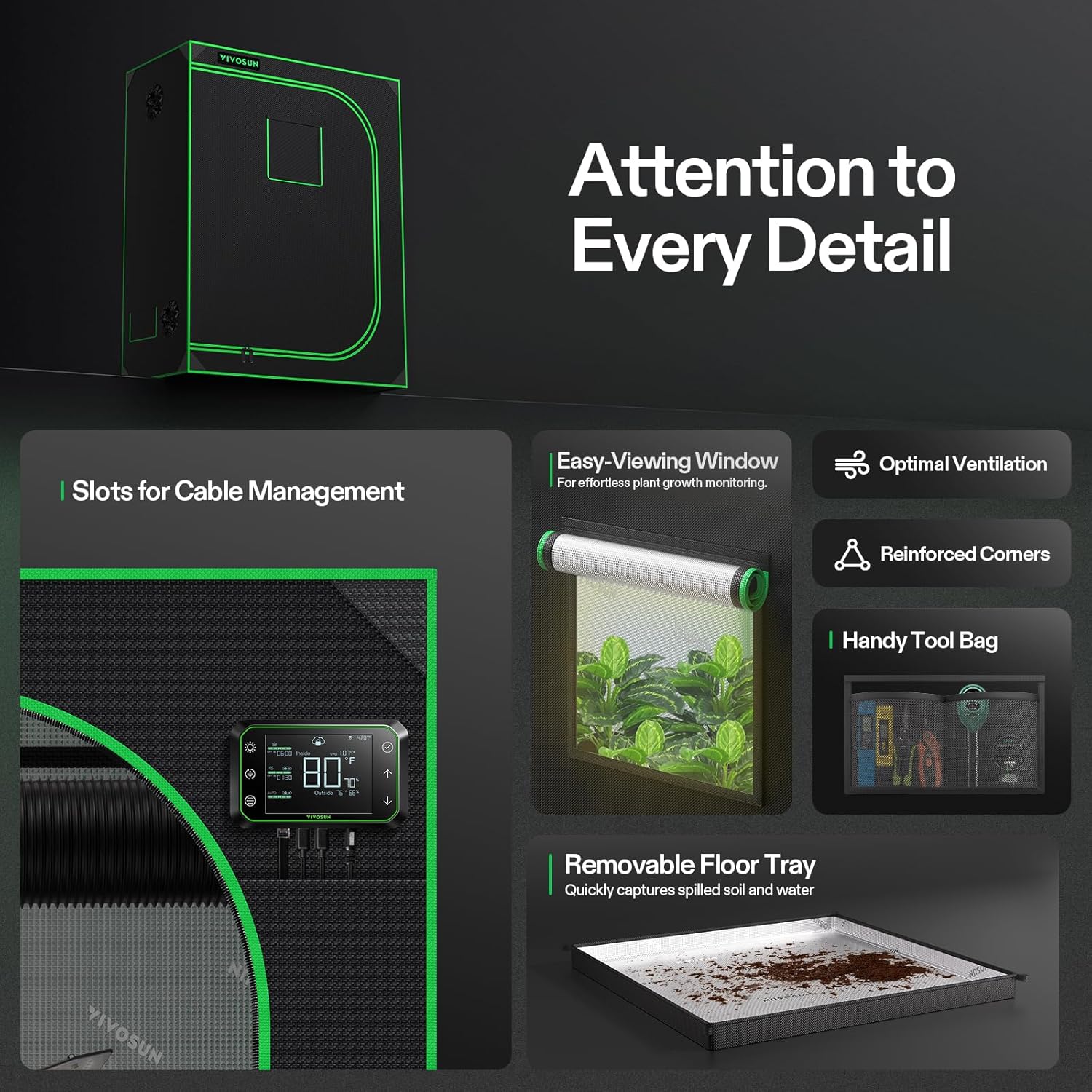 - Easy Observation & Maintenance: With a visible window made by transparent plastic set on the grow tent, you can check the growth status of your plants at any time; The window at the bottom is helpful for heat dissipation; The hook and loop fasteners on the cover of the window are easier for you to open and observe inside; It is also equipped with a removable floor tray that is convenient to be cleaned and conserved