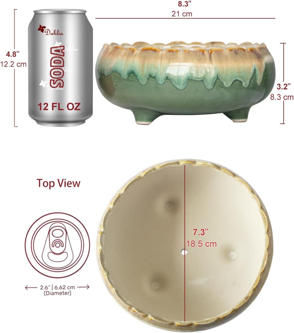Dahlia 8.3'' Inch Large Shallow Drip Glazed Ceramic Planter/Succulent Pot/Plant Pot, Green