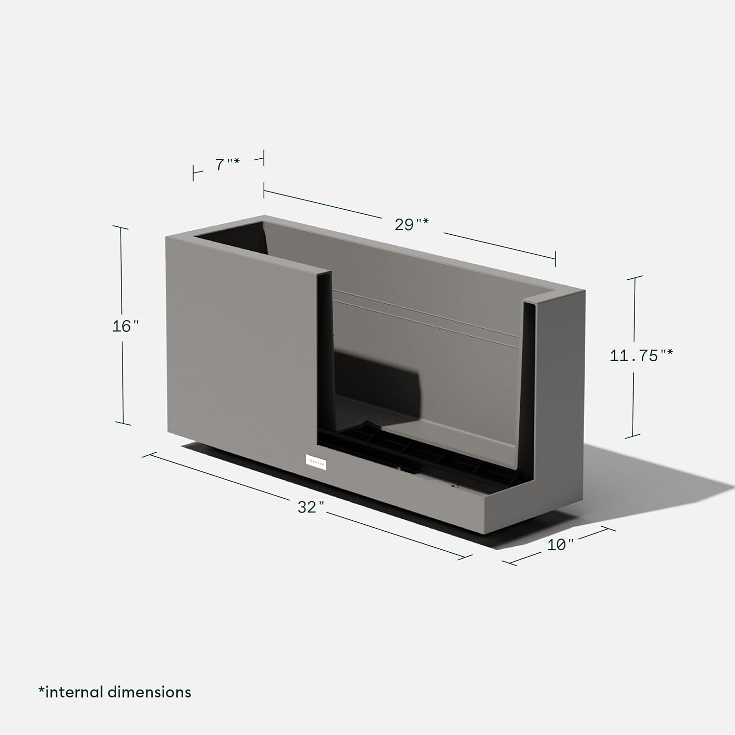 - DIMENSIONS & DETAILS: This double-walled planter’s exterior dimensions measure 16” in Height, 10” in Width, 32” in Length, and the interior dimensions measure 11.75” in Height, 7” in Width, 29” in Length. It comes fully assembled for easy use