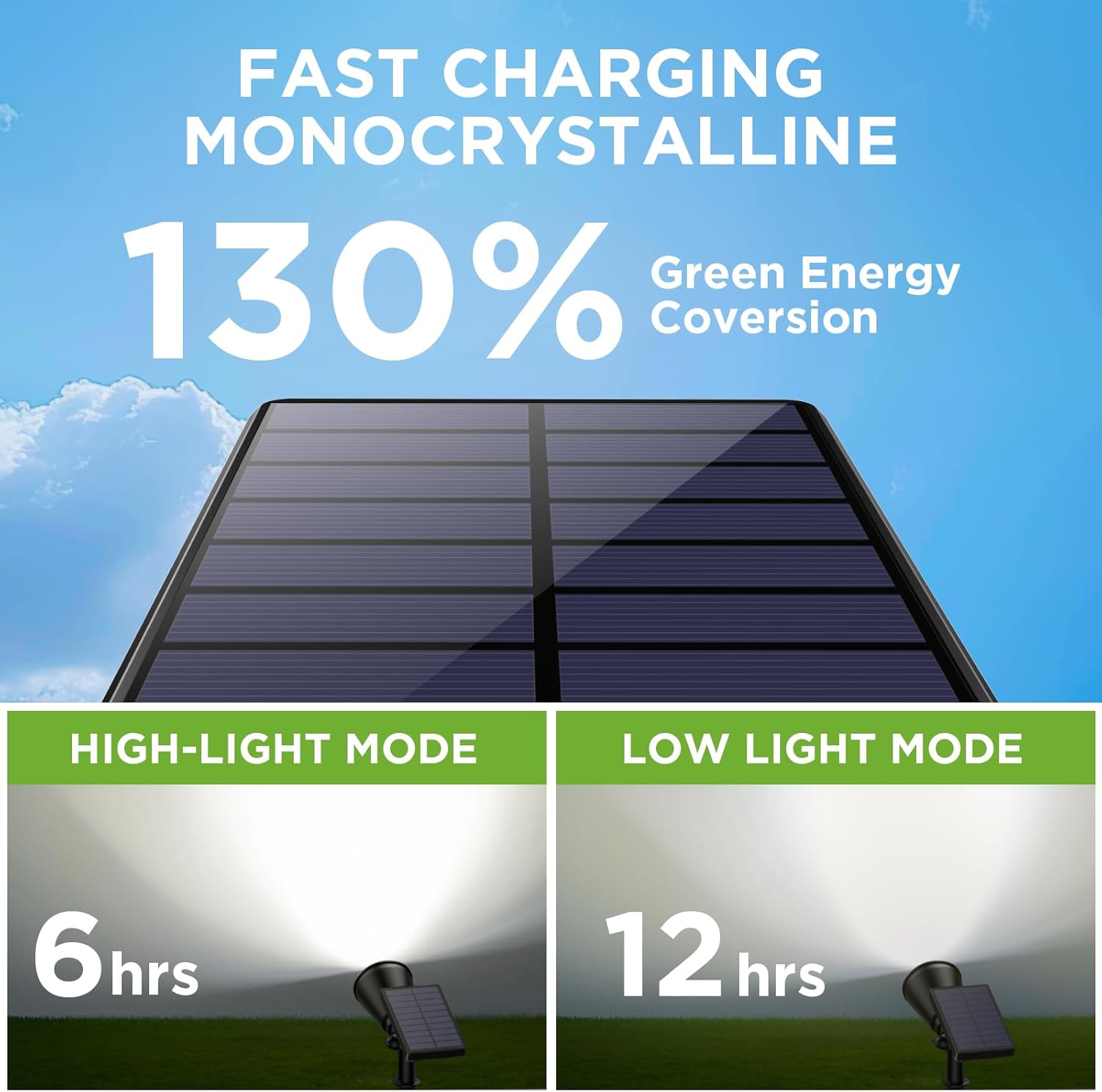 - Improved Brightness & 2 Working Modes: With super brightness, this solar spotlight can cast a focused ray to highlight your flagpole or beautiful sculpture, even on the darkest of nights. You have the option to set from High Mode (MAX 6Hrs) to Low Mode (MAX 12Hrs) to extend working time.