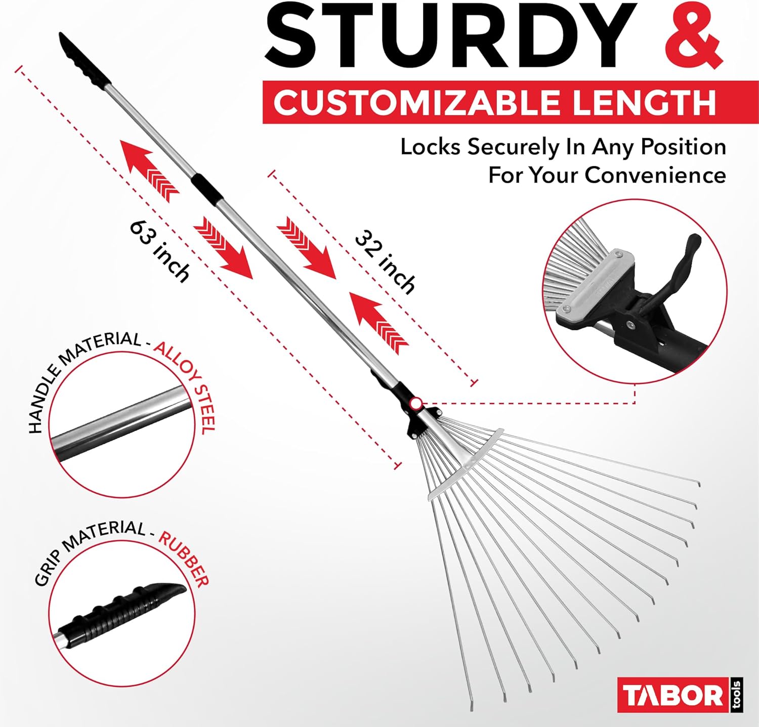 TABOR TOOLS Adjustable Metal Rake - Collapsible & Telescopic - Garden, Yard, & Lawn - Ideal for Leaves, Shrubs & Small Areas. J16A