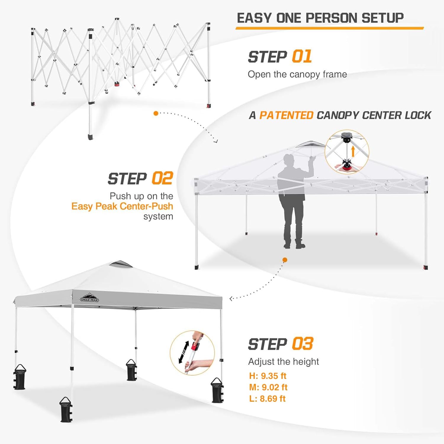 - EASY SETUP: This easy setup pop up canopy tent features the Peak Push system, a patented canopy center lock. The portable canopy requires no tools and easily opens and closes from the center in seconds. Its unique canopy tent center lock enables a quick, one person setup, letting you maximize outdoor time with minimal effort