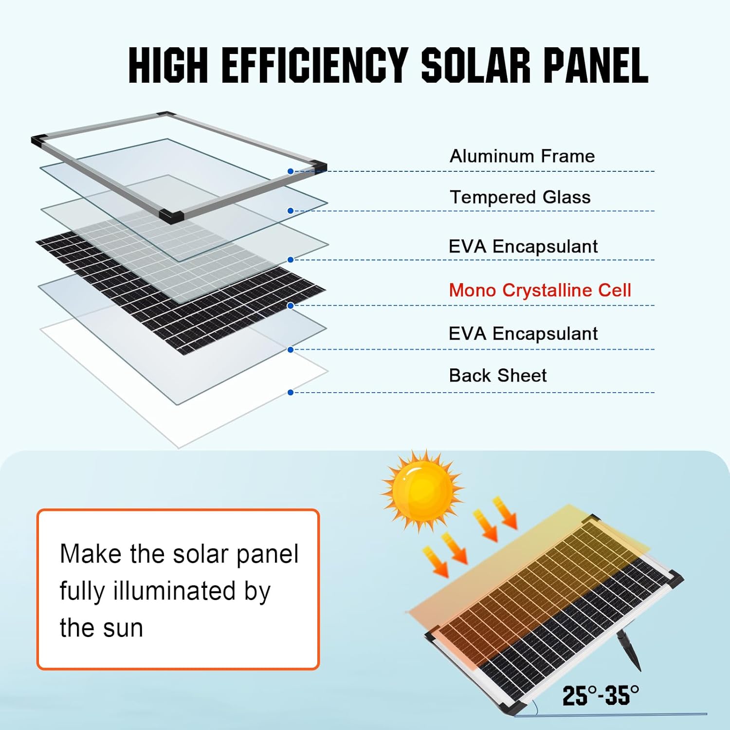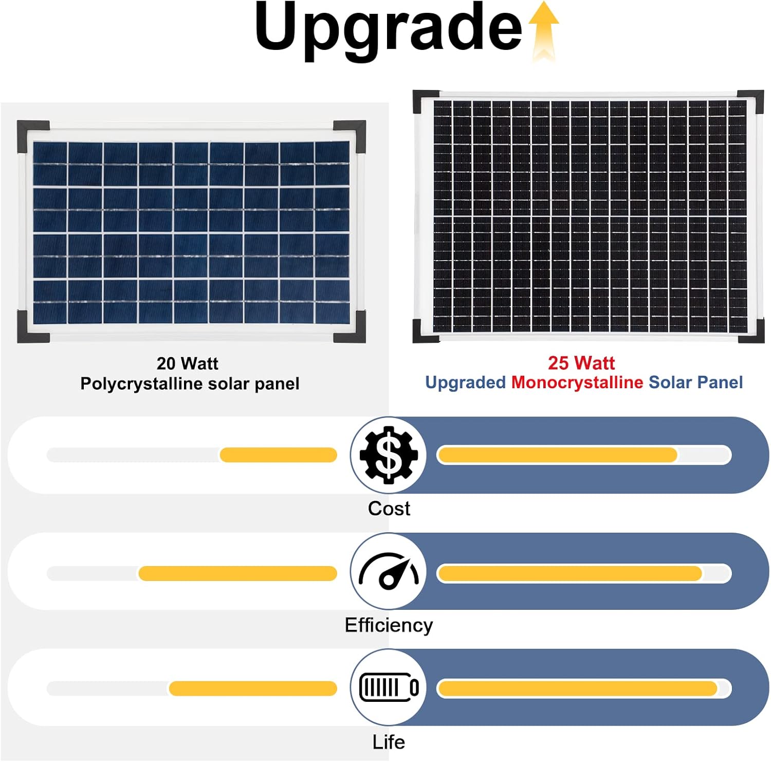- New Model 25 Watt Solar Panel: Upgrade from polycrystalline solar panels to monocrystalline solar panels. Higher cost, better quality, photoelectric conversion efficiency increased by 5-10%, the service life is more than 15 years if in proper use and storage