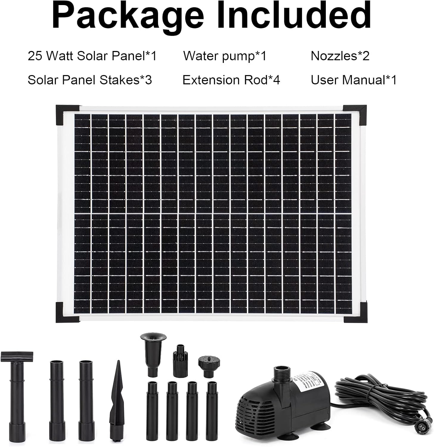 - Package: 25 Watt Solar Panel*1,Water pump*1,Nozzles*2,Solar Panel Stakes*3,Extension Rod*4,User Manual*1. Please read prior to purchasing: This water pump is powered by a solar panel in direct sunlight (battery NOT included). The flow of water is determined by the sunlight intensity.Does not run at night