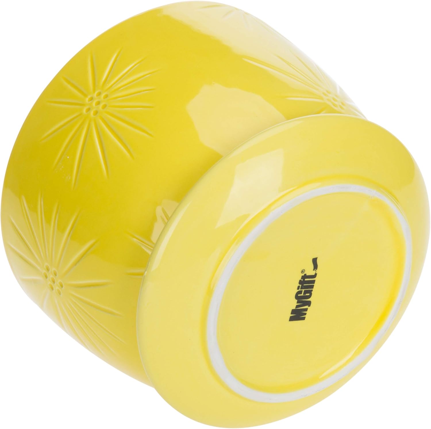 MyGift 7 Inch Round Yellow Ceramic Plant Pot with Drainage Hole and Attached Saucer, Modern Decorative Embossed Sunburst Planter Container for Indoor Home Garden