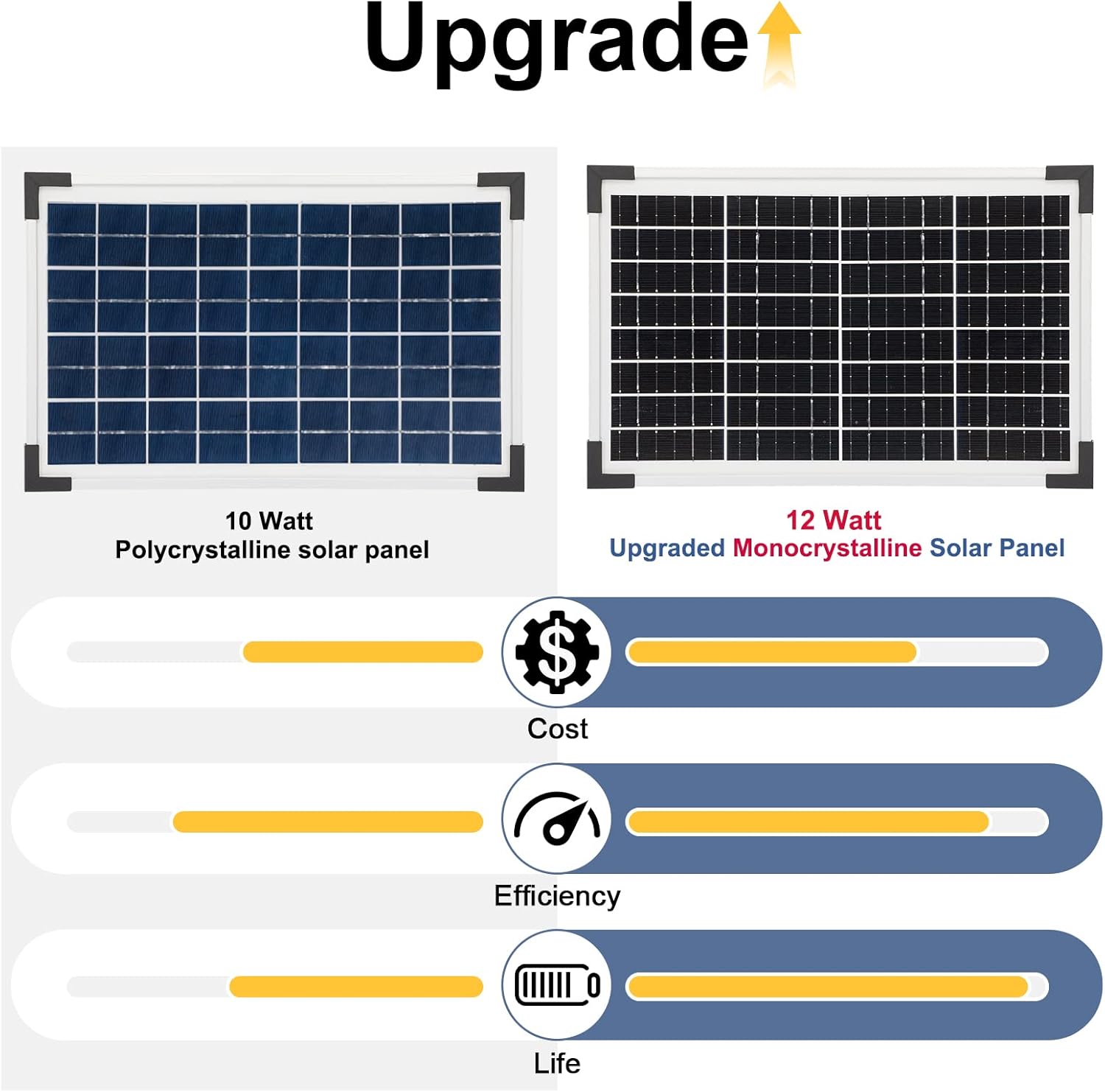 - New Model 12 Watt Solar Panel: Upgrade from polycrystalline solar panels to monocrystalline solar panels. Higher cost, better quality, photoelectric conversion efficiency increased by 5-10%, the service life is more than 15 years if in proper use and storage