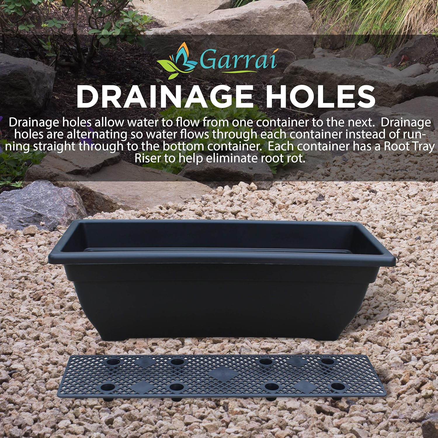 - Drainage: Each planter box comes with a Root Tray Riser and drain holes to help develop a healthy root structures. The drain holes alternate sides of the planter boxes so water flows throughout the flower box. Optional drain plugs included for use indoors. Flowers and plants Not Included.