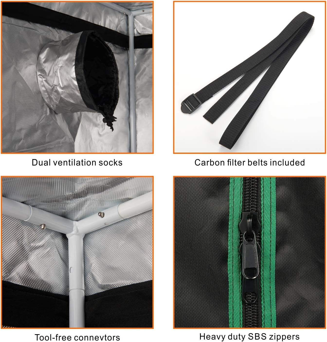- 【High Quality】: This grow tent measures 57"x57"x80'' and is lined with a highly reflective waterproof polyester film and 600D double-stitched canvas. It is perfectly light-proof and tear-resistant, and has excellent durability, safety and stability. It can withstand long-term use to ensure proper temperature and make plant healthy growth.