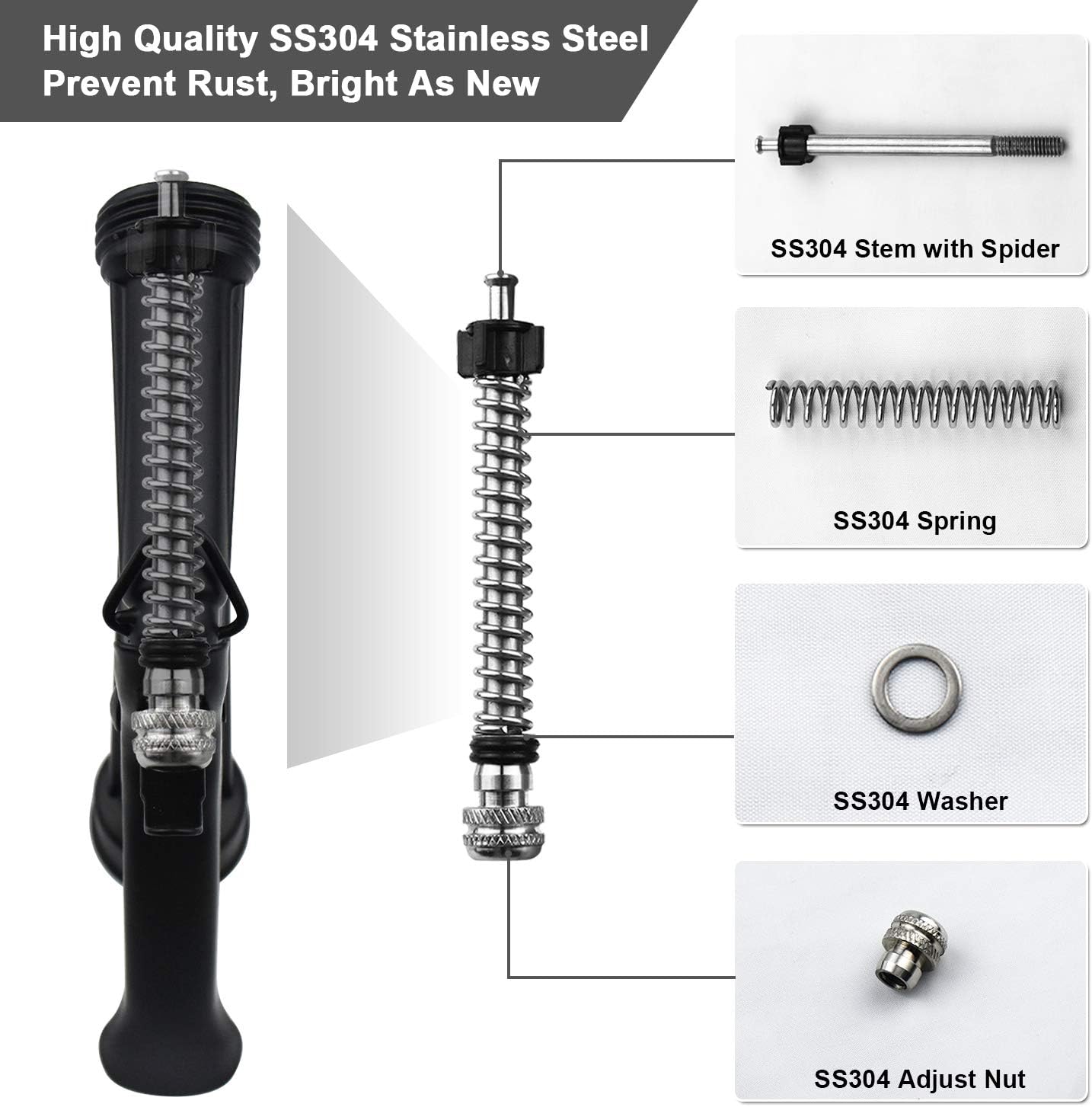 - High Quality Accessories—SS304 Stem with Spider and SS304 Adjust Nut, SS304 Spring prevent rust and keep bright. SS304 Washer obstruct springs and seals for increased service life.