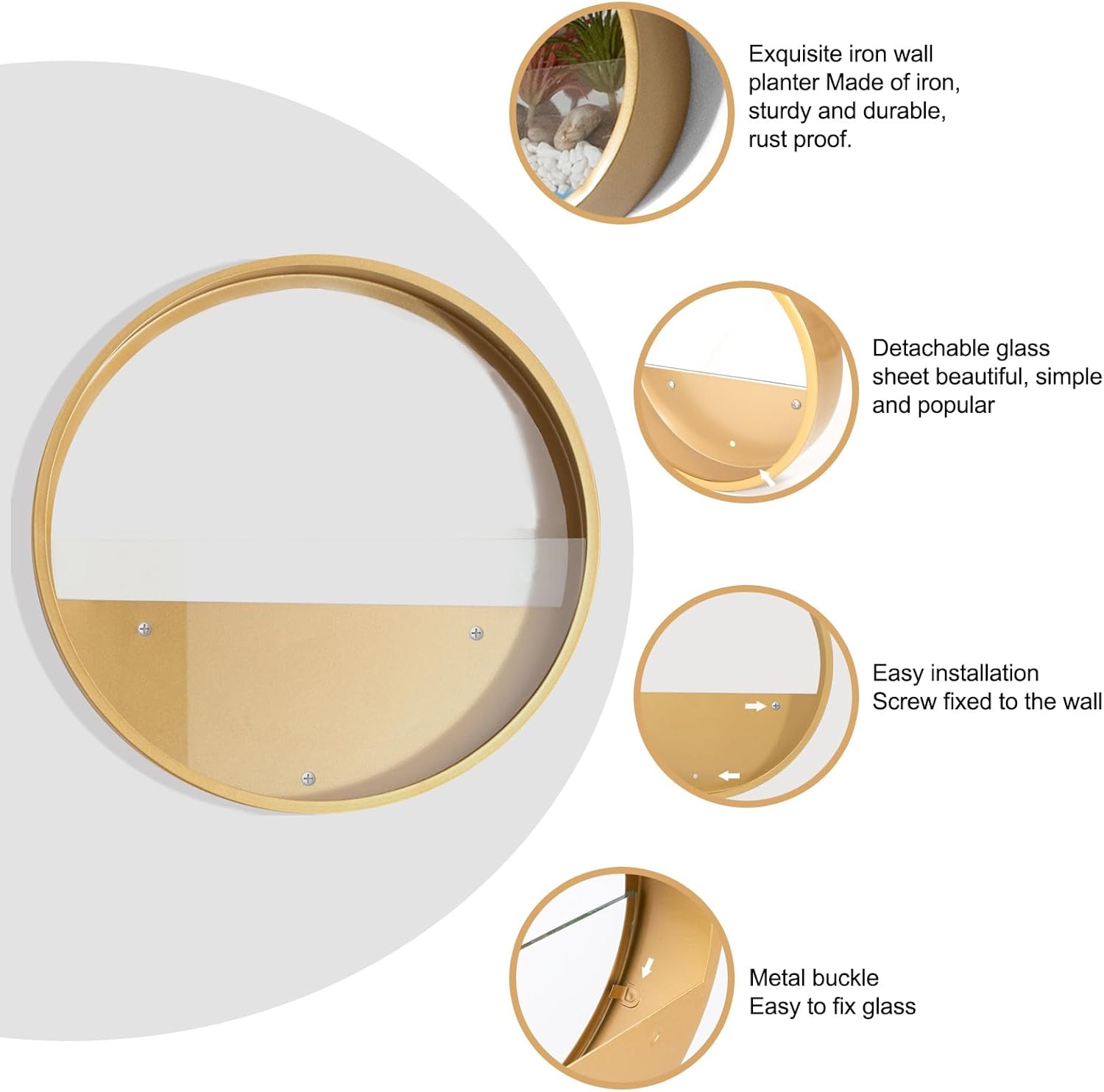 3 Pack Set Wall Planters,Modern Round Glass Wall Planter Succulent Planter Circle Iron Hanging Planter Vase for Herb,Small Cactus Perfect for Balcony, Room and Patio Decor (Gold)