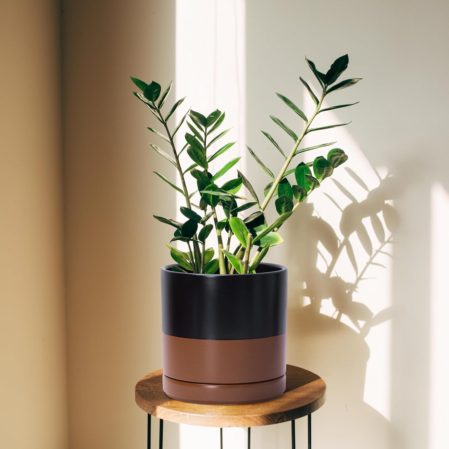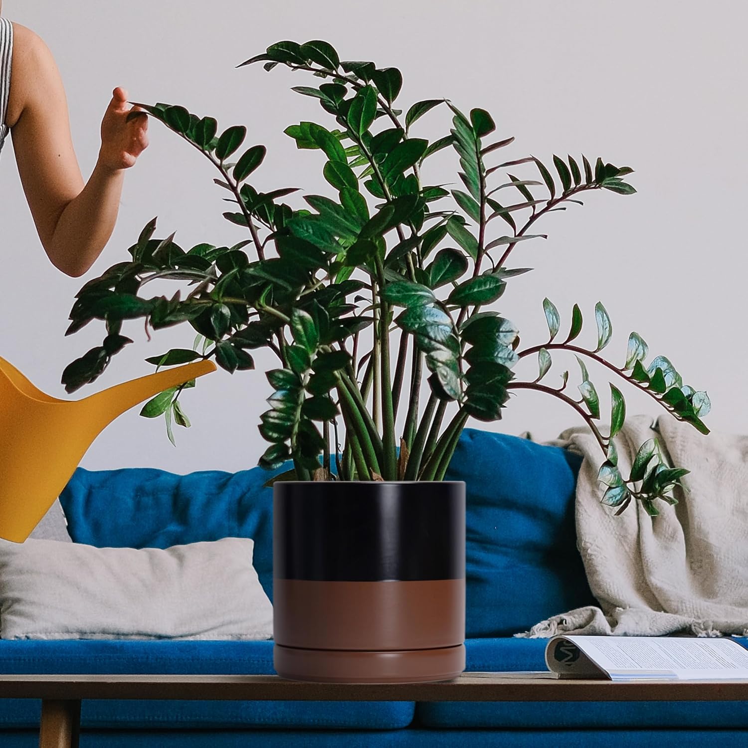 D'vine Dev 6.5 Inch & 8.2 Inch Ceramic Planter Pots for Plants with Drainage Hole and Saucer, Medium Plant Pots Set, Black/Speckled Tan, 94-G-M-7