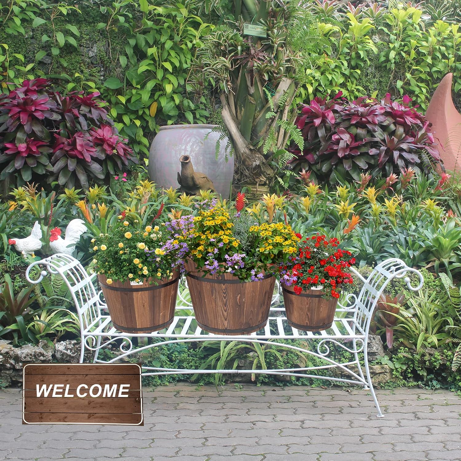 VINGLI 3 PCS Large Wooden Planter Barrel Set, 11.5"(Dia)- 18"(Dia) Real Wood Indoor/Outdoor Flower Pot w/Drainage Holes, Different Sizes, Large Garden Container Box