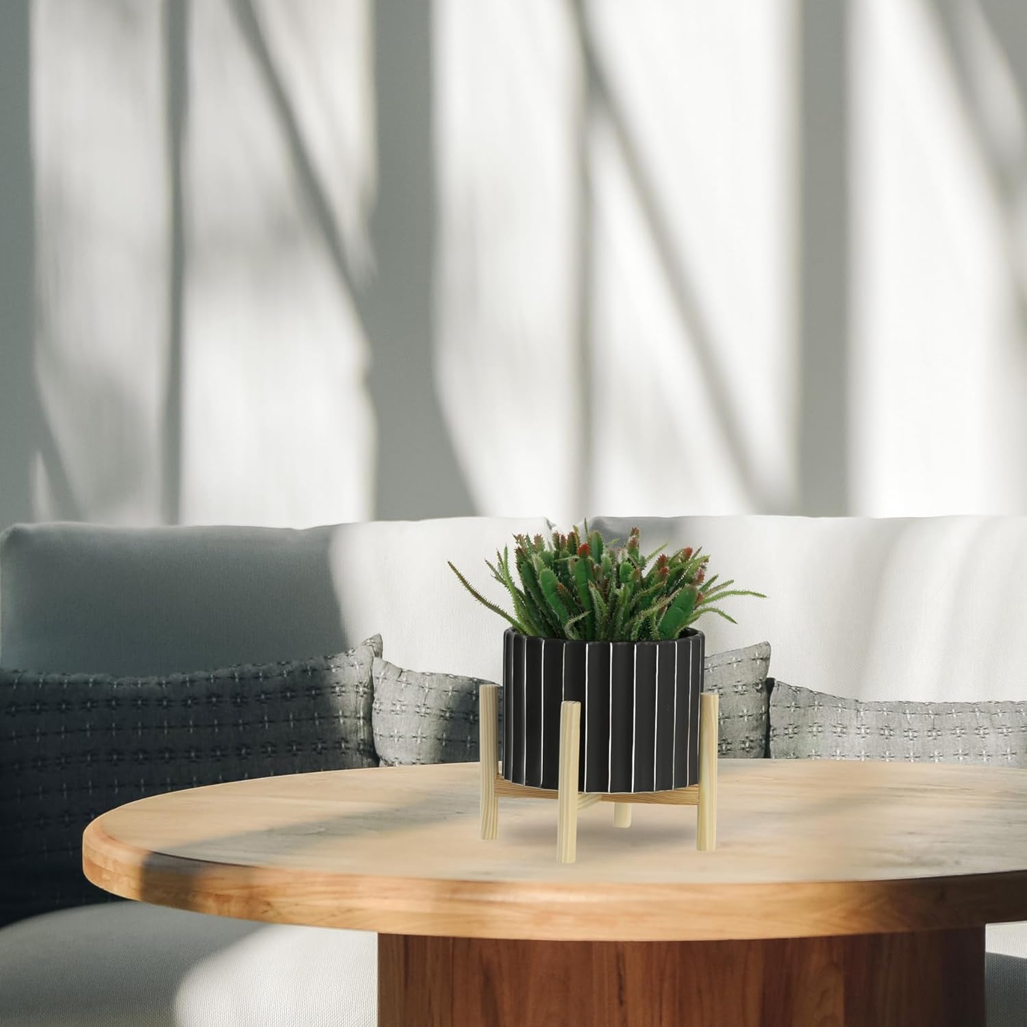 - Sleek Modern Style: This 9" black ceramic planter with vertical fluted design and pine wood stand adds bold elegance to contemporary, minimalist, or bohemian-inspired home decor.