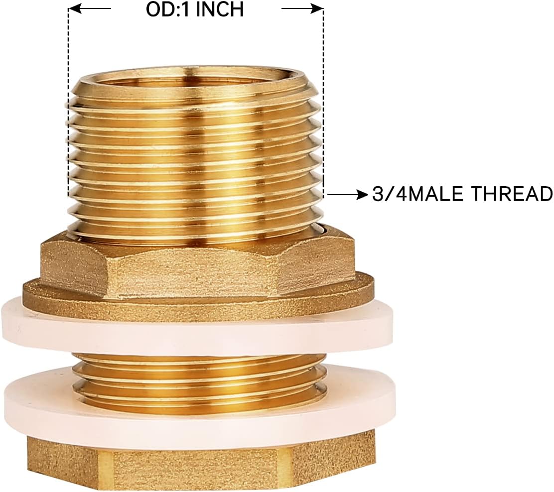 - đź’§Heavy Duty 3.2 oz Solid Brass Bulkhead Fitting, 1/2" Female to 3/4" Male water tank connector bulkhead tank fitting. Heavy duty 3/4"water outlet no kink quarter turn solid brass ball valve can conntect with garden hose.