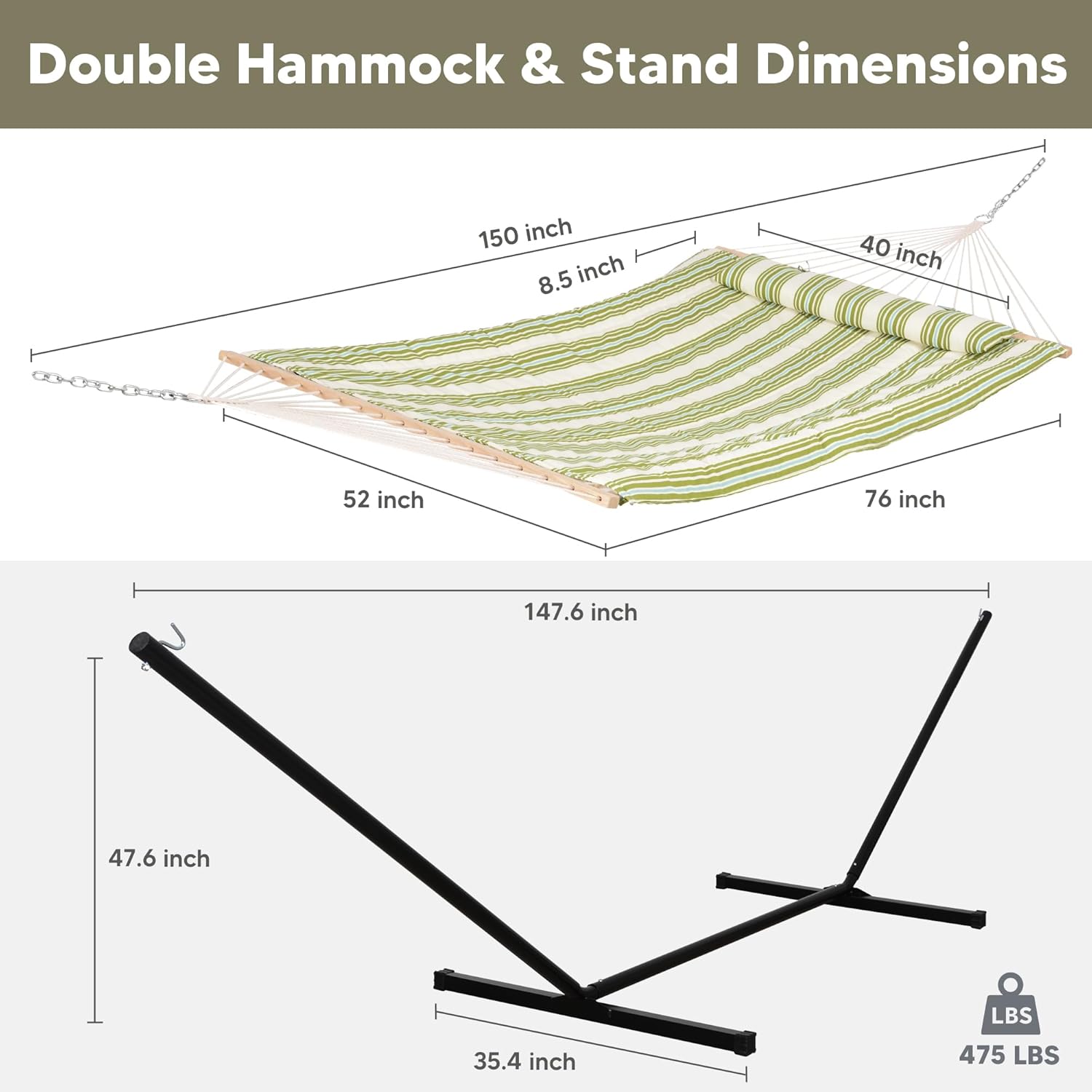 - Large Size: Hammock bed: 76" long x 52" wide. Hammock pillow: 40" x 8.5". This heavy duty hammock is made for sharing. Designed to support up to 475 lbs, you could enjoy the relaxing swing of the hammock with friend or family