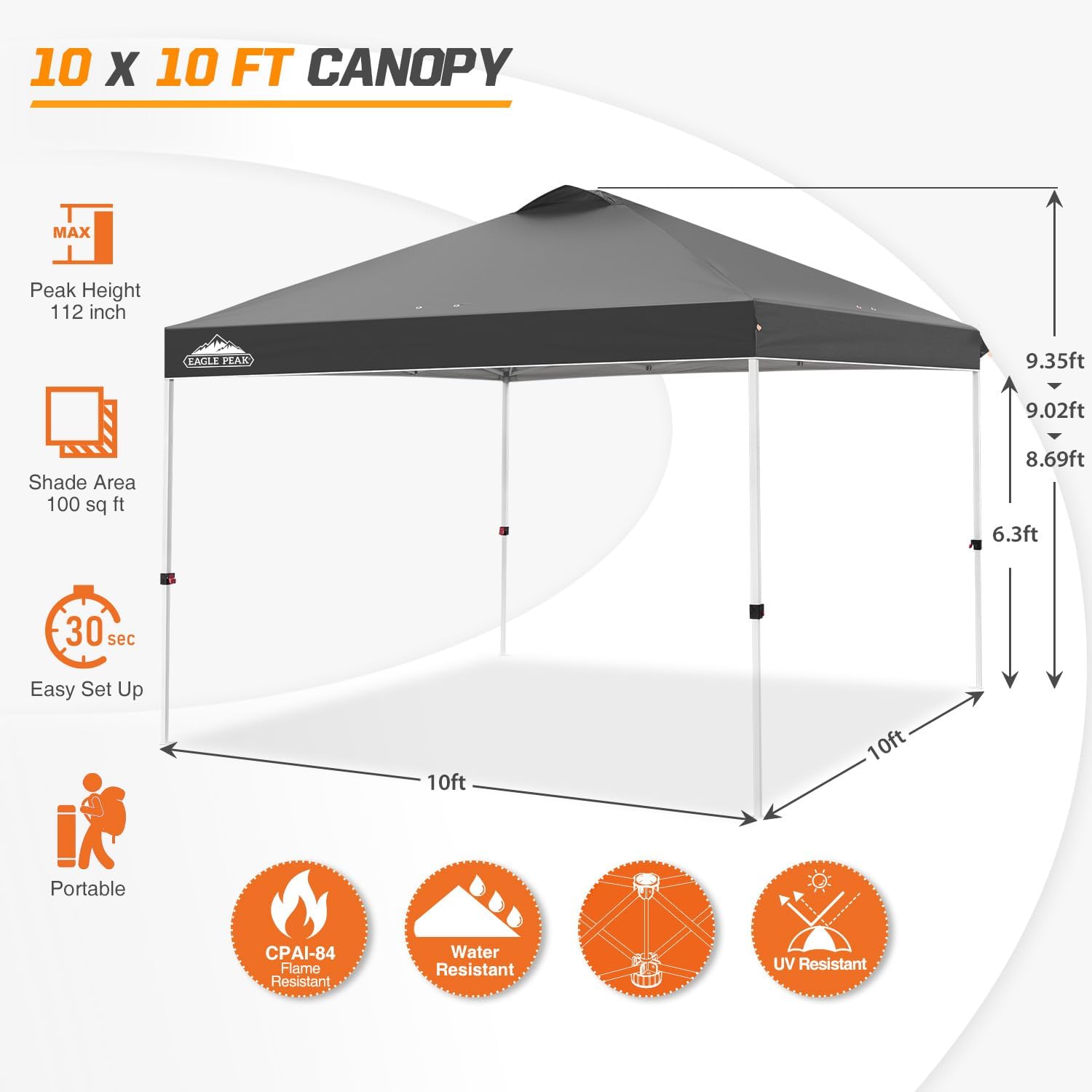 - HEAVY DUTY TOP WITH VENTED DESIGN: The EAGLE PEAK canopy features a CPAI-84 rated 150D silver-coated oxford top with double-stitched and heat-sealed seams for long lasting waterproof performance. This durable pop up canopy provides UPF 50+ sun protection and a large vent at the peak to release heat; ideal for staying cool at outdoor events, markets, or backyard gatherings