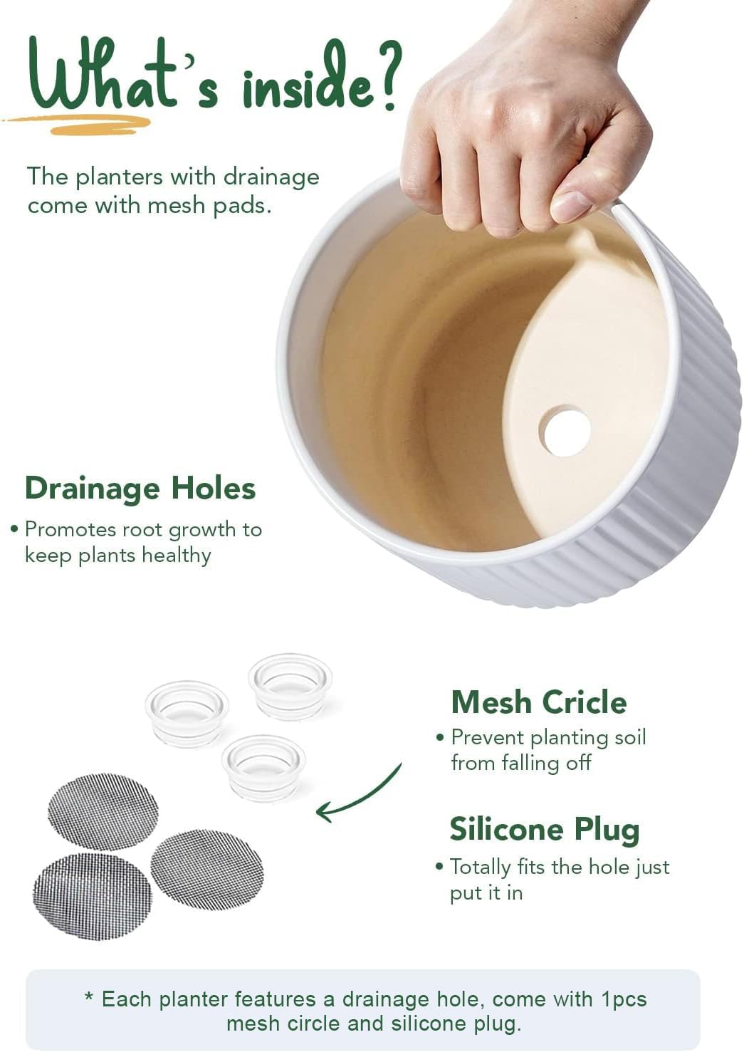- Thoughtful Accessories: Each indoor plant pots features a drainage hole at the bottom to prevent overwatering—key to avoiding root rot. We include a removable silicone plug for indoor use and mesh pads to keep soil in place and water flowing, giving you full control over plant hydration