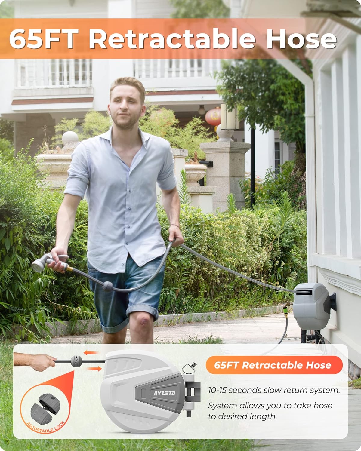 Ayleid Retractable Garden Hose Reel,1/2 in x 65 ft Wall Mounted Hose Reel, with 9- Function Sprayer Nozzle, Any Length Lock/Slow Return System/Wall Mounted/180°Swivel Bracket (Grey)