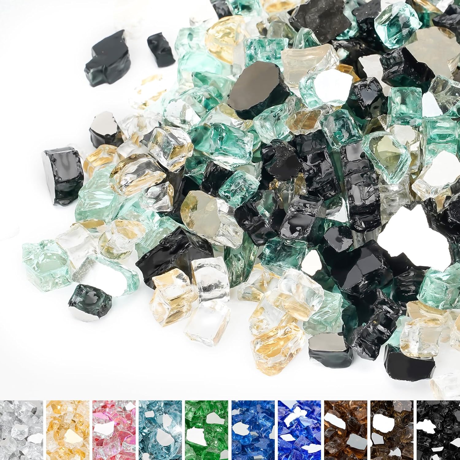 Mr. Fireglass 10 Pounds Blended Fire Glass - 1/4 Inch Mixed Colored High Luster Reflective Tempered Fireglass Rocks for Fireplace Fire Pit Table and Landscaping, Light Green+Onyx Black+Platinum