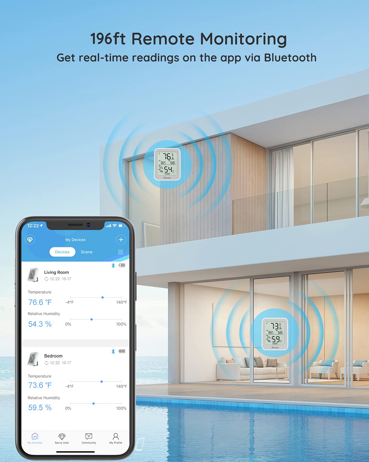 - Easy to Connect: Simply download the Govee Home app, search for and select H5075, and pair it successfully within minutes. With a 196ft/60m Bluetooth range, you'll be notified of any air changes immediately.