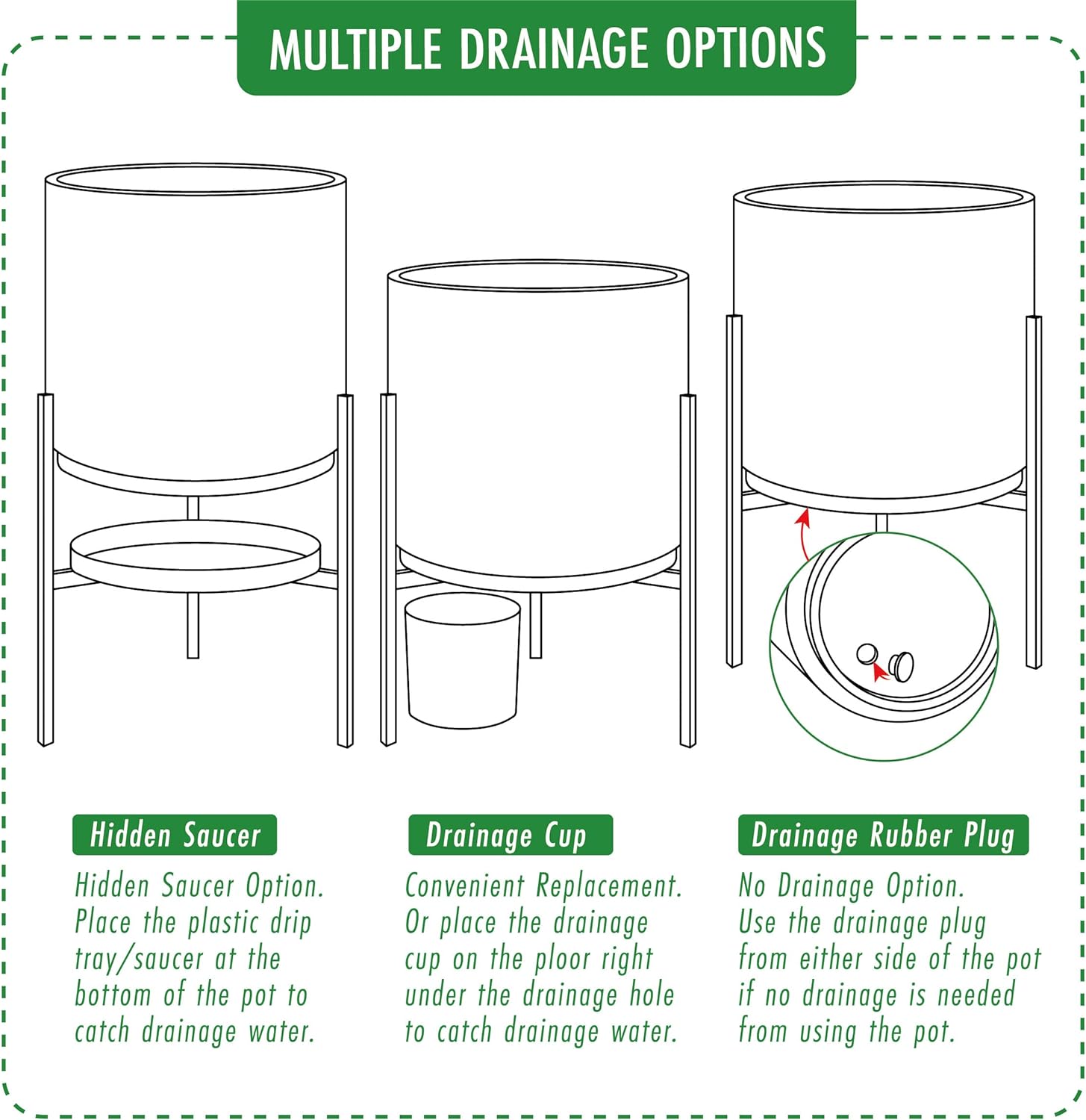 - Complete Set: The set includes the pot with drainage hole, the metal stand, a mesh net, rubber plug, ceramic balls planter filler, and a drainage cup.