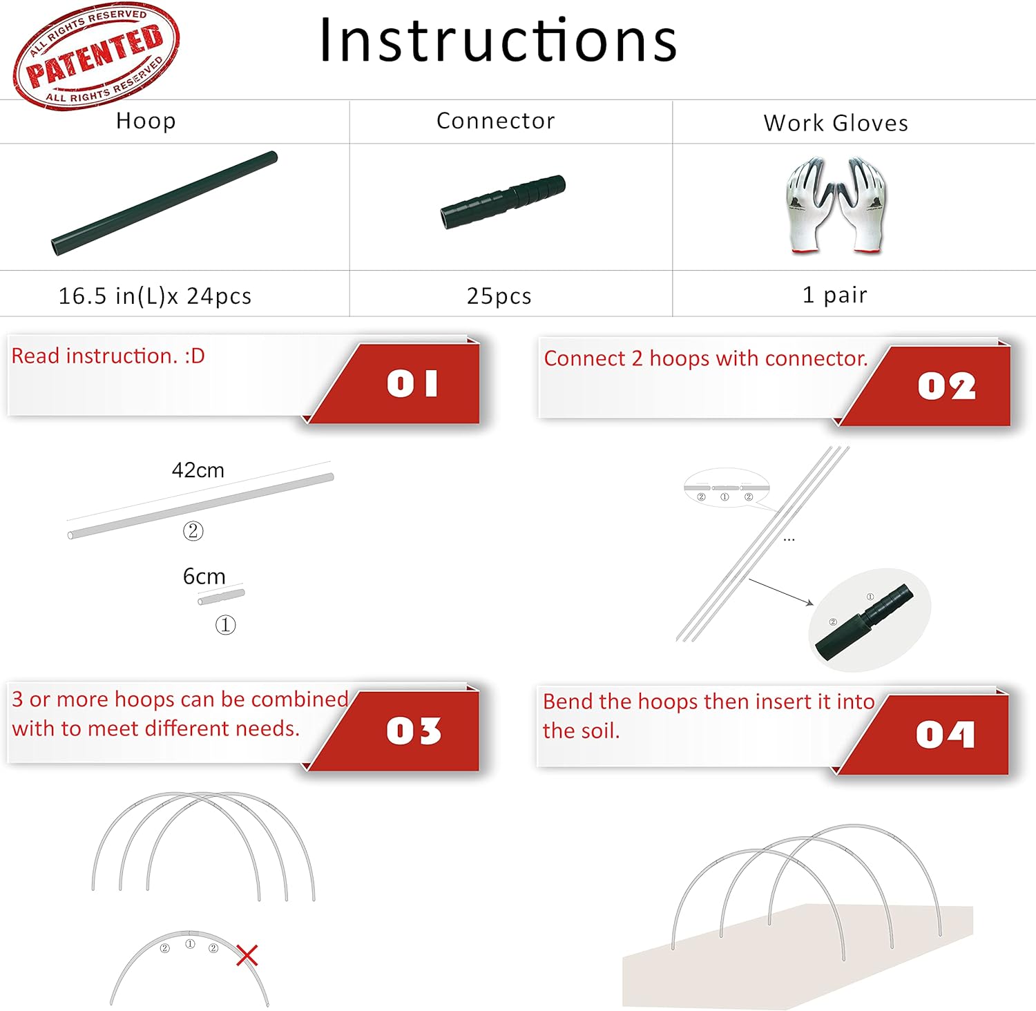 - Easy to Assemble - Connect a certain number of hoops with connectors according to your needs. Bend the assembled hoop then insert it into the soil. These parts can be used season after season.