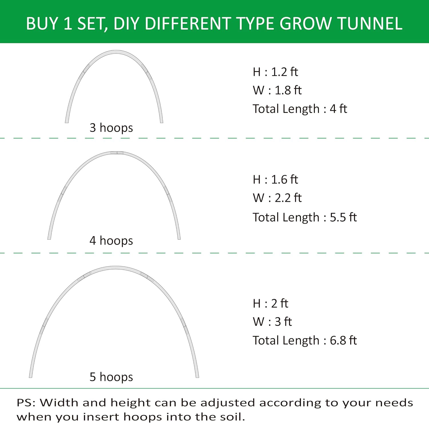 - Follow Your Heart - There is no need to spend more money to buy different size grow tunnel now. Buy 1 set, DIY your own grow tunnel. Combined with 3 or more hoops to fit your different needs. Each hoop is 17 inches in length that is easy to store.