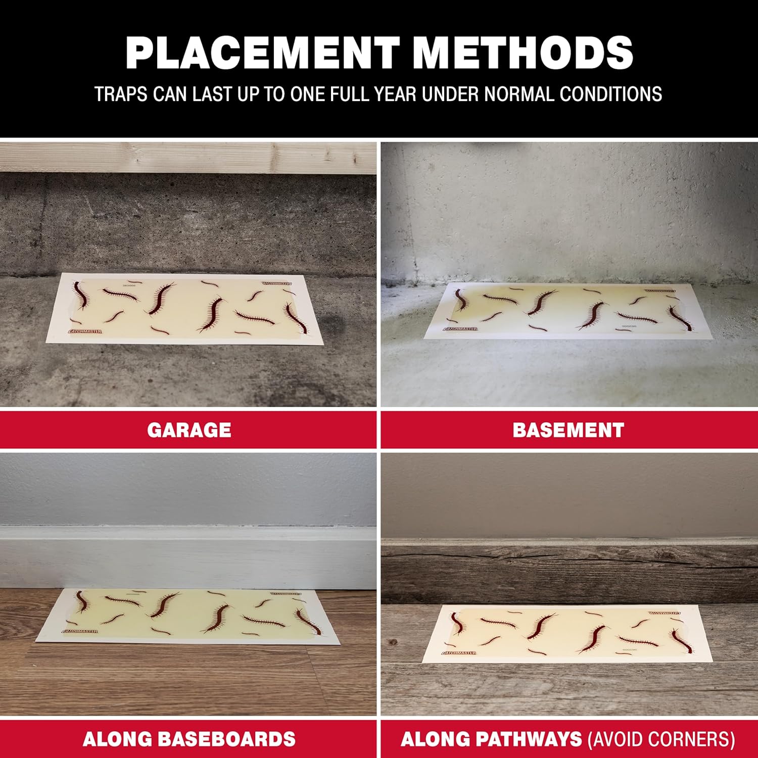 - YEAR-ROUND CONTROL: Catchmaster glue traps are pesticide-free and mess-free. This centipede and bug catcher is an effective and easy solution for insect problems. When placed in an area with normal conditions, insect traps indoor can last up to one full year.