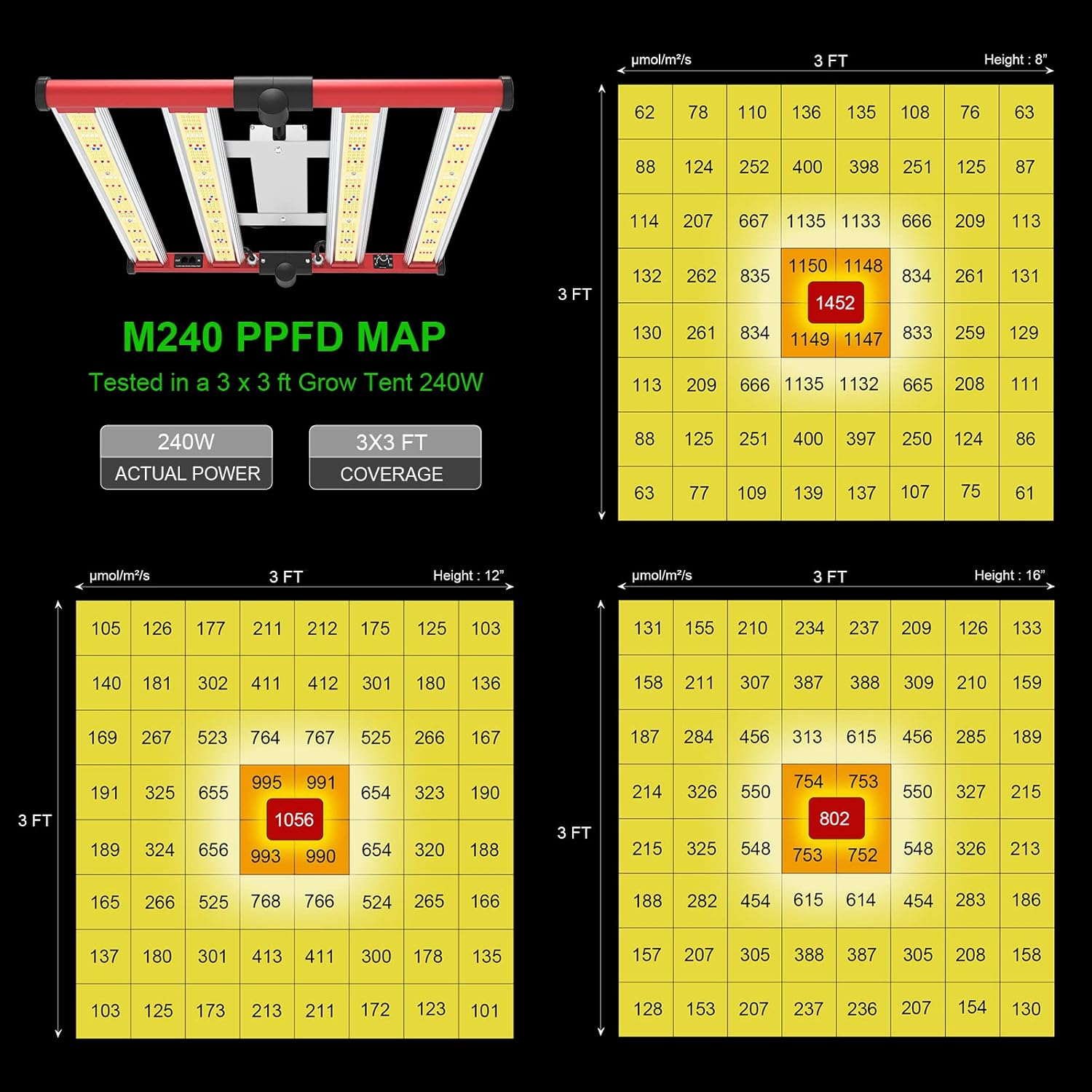 - MAXIMIZE YIELDS & CROP QUALITY - AGLEX M240 led plant growing light comes with 780PCS diodes, only consumes 240w with 780 leds, achieving higher average PPFD with 1056 μmol/㎡/s at 3x3ft core coverage. The average yield is more than 2.5g per wattage. The 240w led bar grow light can help you achieve maximum quality and quantity. Wide Input Voltage 100-277V, can meet most input voltage.