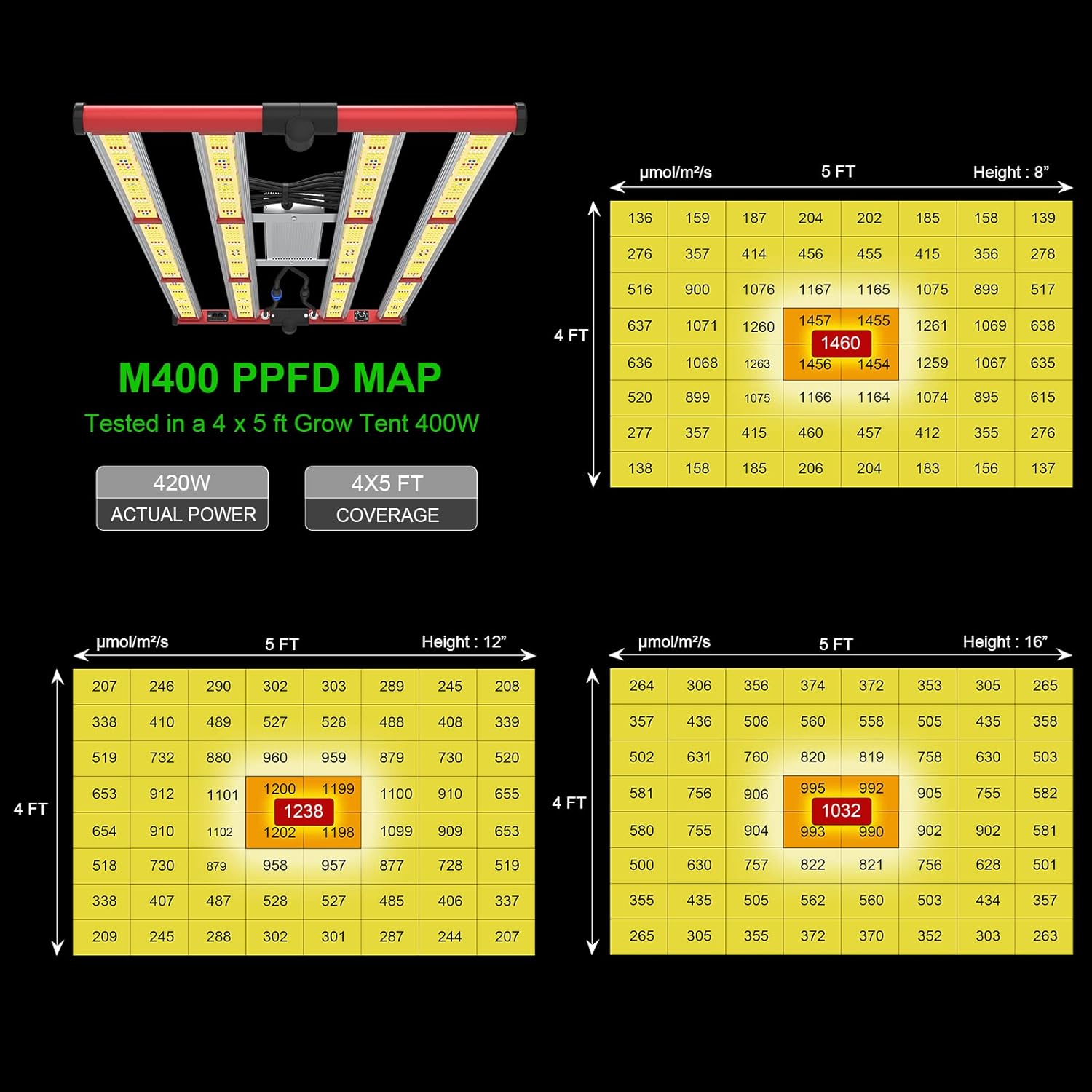 - MAXIMIZE YIELDS & CROP QUALITY - AGLEX M400 led plant growing light is with 1360PCS high efficient chips, only consumes 420w with 1360 leds, achieving higher average PPFD with 1238μmol/㎡/s at 4x5ft core coverage. The average yield is more than 2.5g per wattage. The 420w led bar grow light can help you achieve maximum quality and quantity. Wide Input Voltage 100-277V, can meet most input voltage.