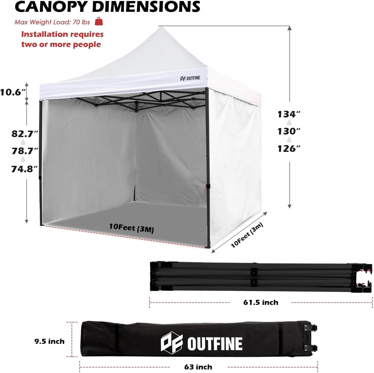 OUTFINE Heavy Duty Canopy 10x10 Pop Up Commercial Canopy Tent with 3 Side Walls Instant Shade, Bonus Upgrade Roller Bag, 4 Weight Bags, Stakes and Ropes (White, 10 * 10FT)