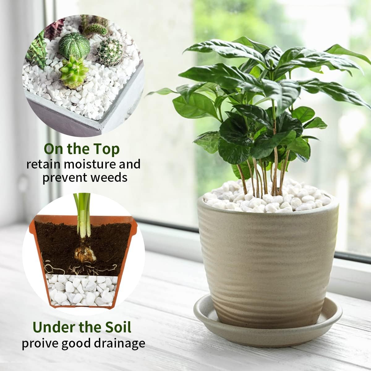 - 【White Rocks】Small white stones are polished without sharp edges and will not harm your succulents or potted cactus. Covering the soil with a layer of white gravels will not only make your succulents stand out, but also keep the soil moisture and help plants grow better. Spread white rocks over the soil surface of indoor potted plants to create a clean and tidy appearance