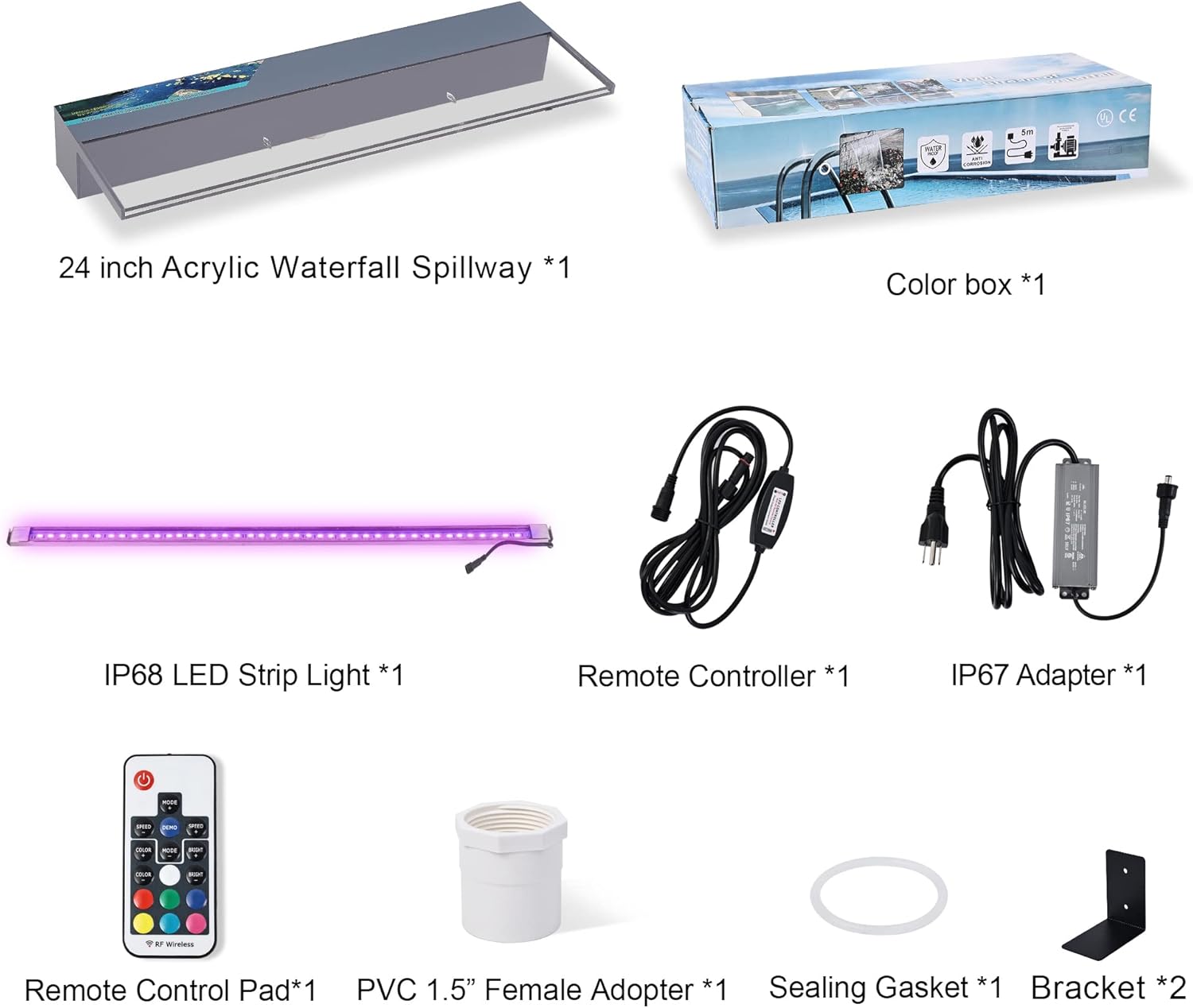 - * SUMGREEN Lighted Acrylic Pool Spillway comes with 1x Acrylic Spillway, LED strip light set, remote control and Female Coupling