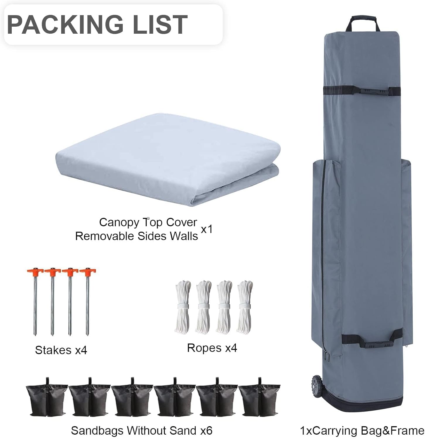 - 👍Packing List:1 10x20 Pop Up Canopy Top Cover and Canopy Frame + 4 10ft-Removable Side Walls + 4 5ft-Side Walls + 1 Carrying Bag + 6 Sand Bags without sand + 4 stakes and ropes.
