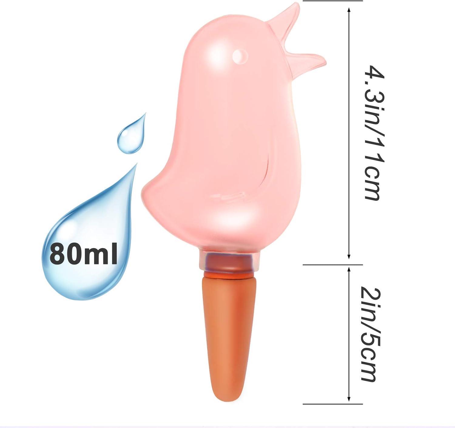 - 【Package Includes】 The set contains two different colors creative bird-shaped automatic watering devices, three pieces of blue and three pieces of Light pink, totally four pieces. The size of each plant waterer is 6.54×2.76 inch.