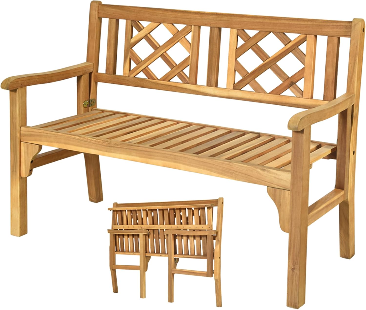 Tangkula Folding Outdoor Wood Garden Bench, Foldable Acacia Wood Patio Bench with Wide Curved Armrest & Backrest, Outside 2-Person Loveseat Chair for Entryway, Yard, Deck, Balcony & Park