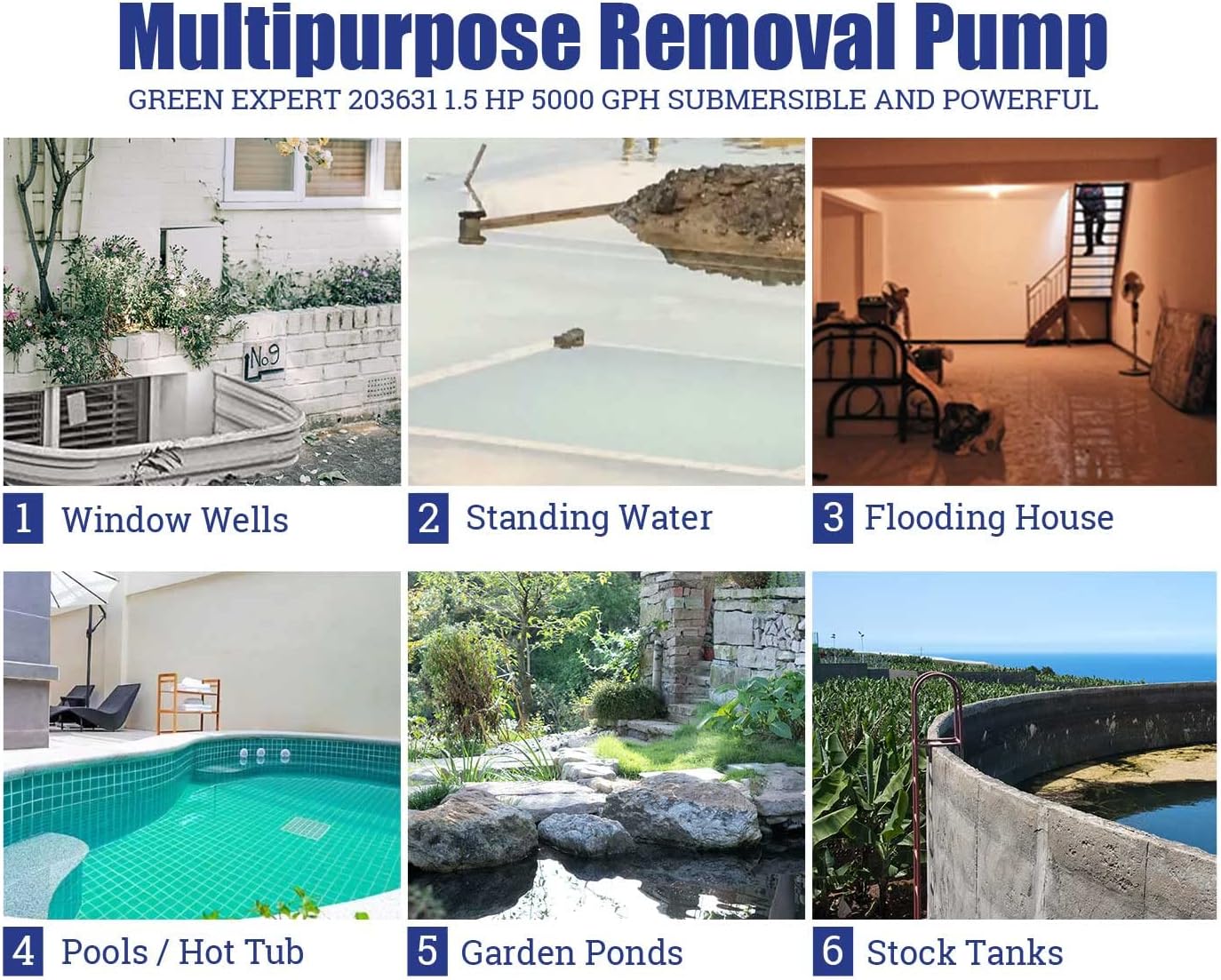 Green Expert 1.5HP Submersible Sump Pump High Flow 5000GPH 25ft Power Cord Manual Automatic On/Off for Water Removal from Basement Sump Pit Pools Hot Tub Spas Garden Pond