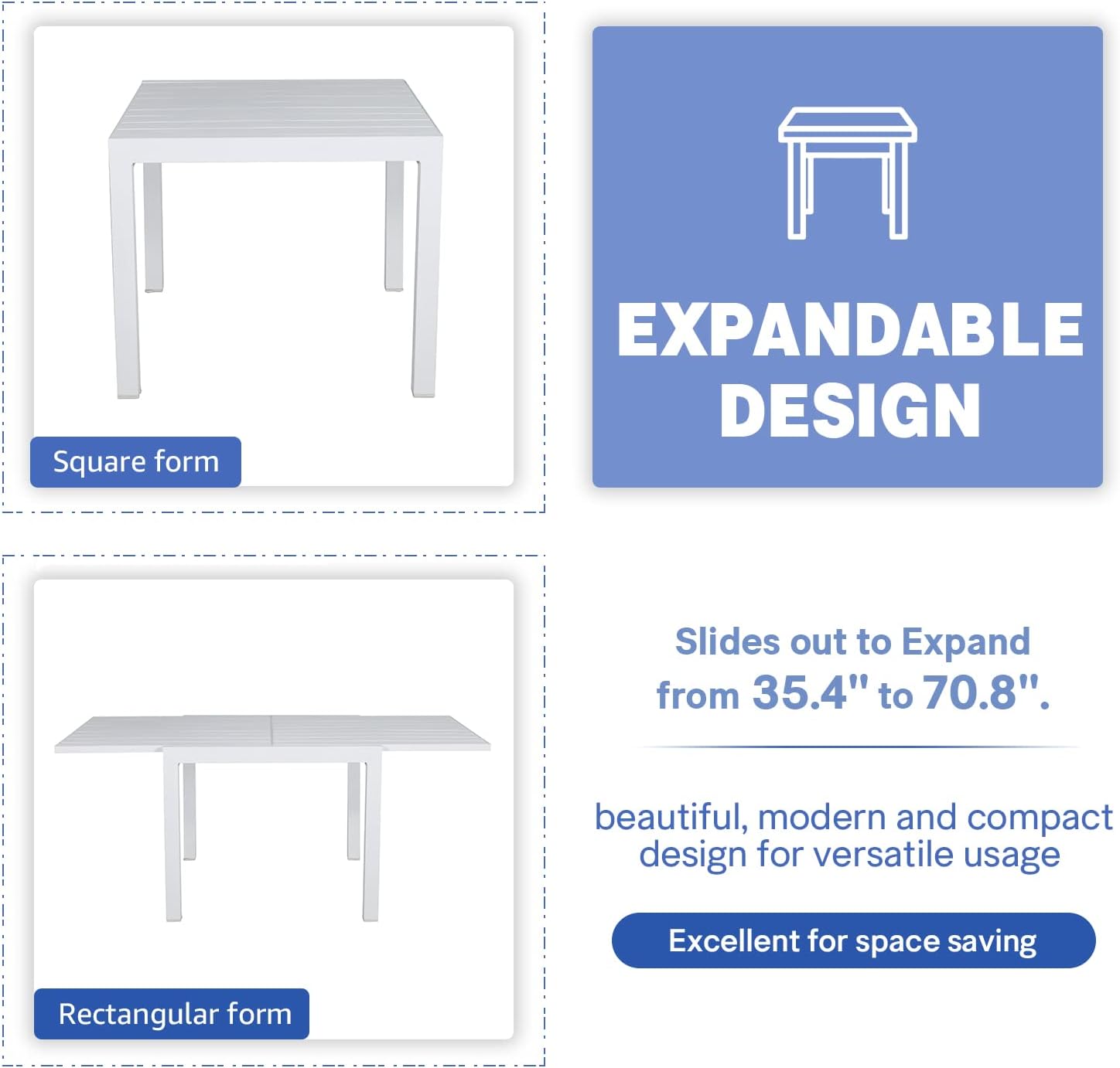 - ăMODERN DESIGN & ELEGANT APPEARANCEă: With clean-cut lines, our expandable patio table is the ideal modern accessory for your indoor/outdoor space. Finished with smooth aluminum frames and a slatted design, this outdoor table not only offers a chic, minimalistic look but also provides a stable structure.
