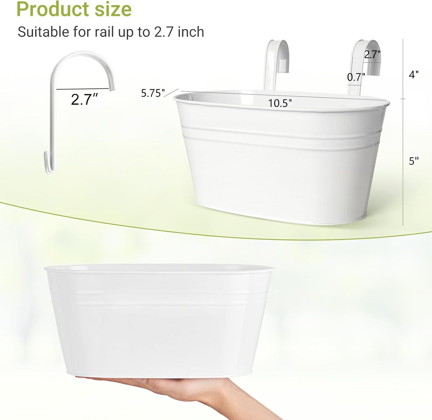 - Smart Size:Planter:10.5" x 5.75" x 5". Hook is 4" x 2.7” x 0.7"(Suitable for rail up to 2.7 inch). Please check the size carefully before purchasing. Pay attention to:The hook is disassembled for transportation,you need to install the iron bucket yourself when it arrive.