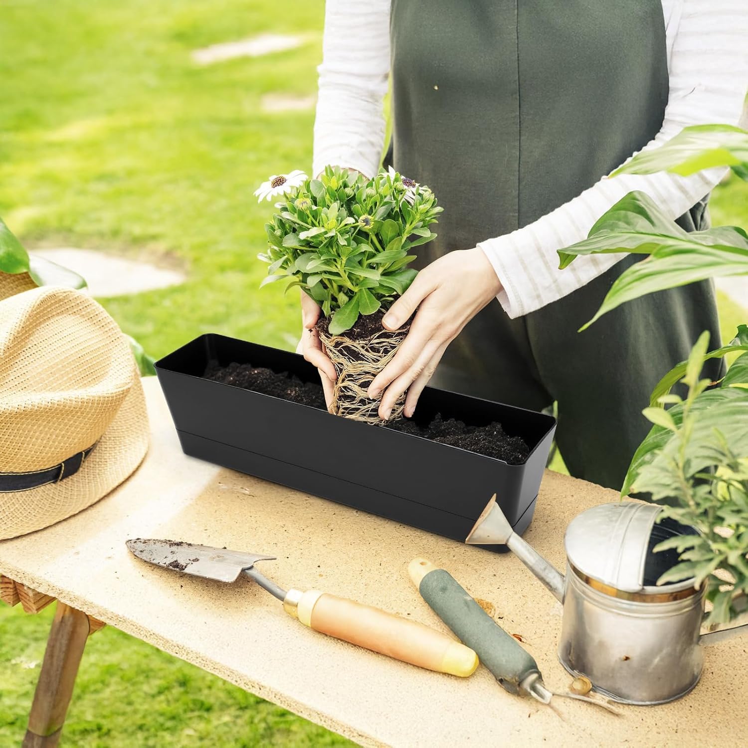 - 【16inch Window Box Planter】Dimensions: 16×3.8×3.3" (planter) + 15.1×3×1.2" (saucer). Perfect for herbs, succulents, cacti, lilies, or faux plants. Holds soil, pebbles, or decorative stones.