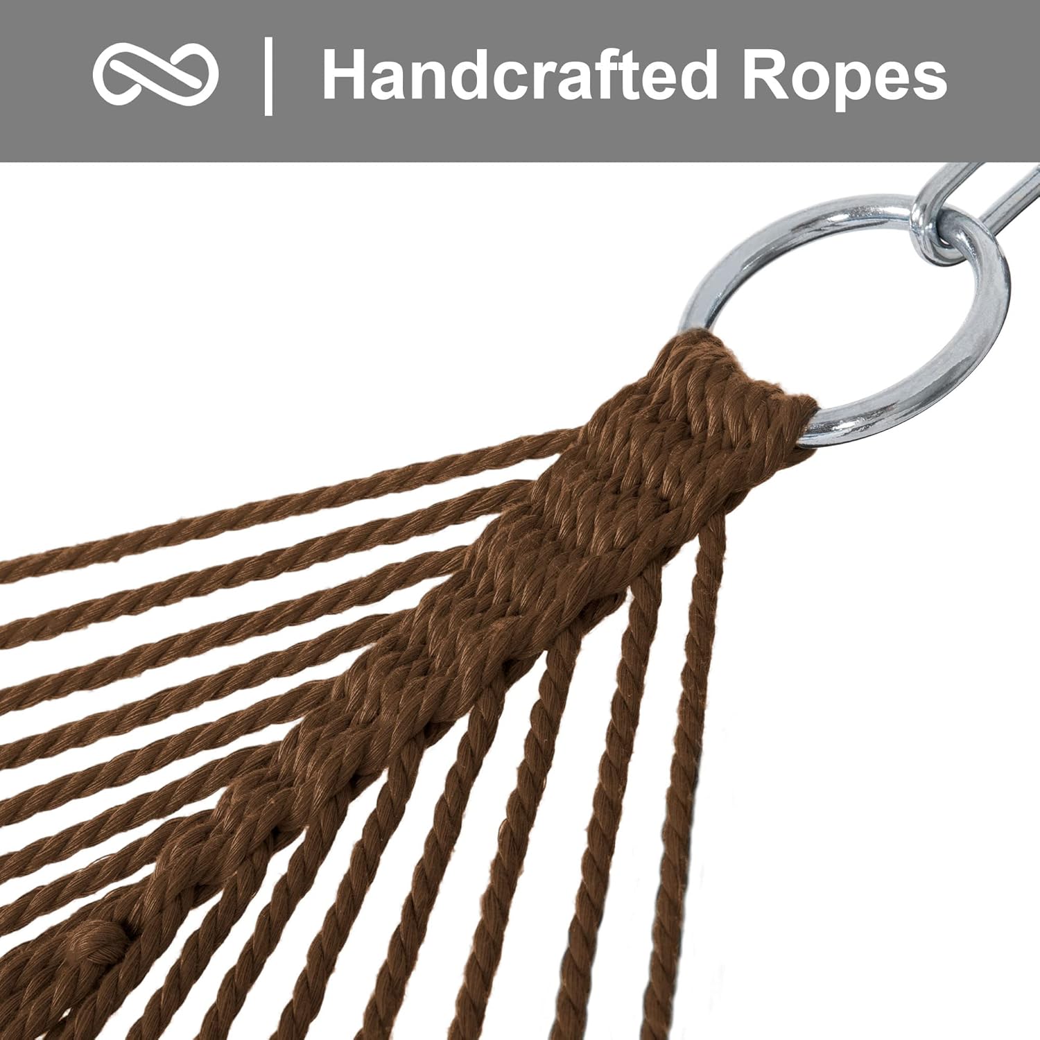 - Strong Max-Density Rope: Polyester ropes are weather resistant and won't sag after long term use. The 3 ply twisted polyester ropes ensure maximum density and perfect flexing capability. The 20 suspension cords at both ends of the hammock bed ensure even weight distribution and better balance. Skilled artisans meticulously hand weave the bed to achieve the precision and balanced loops