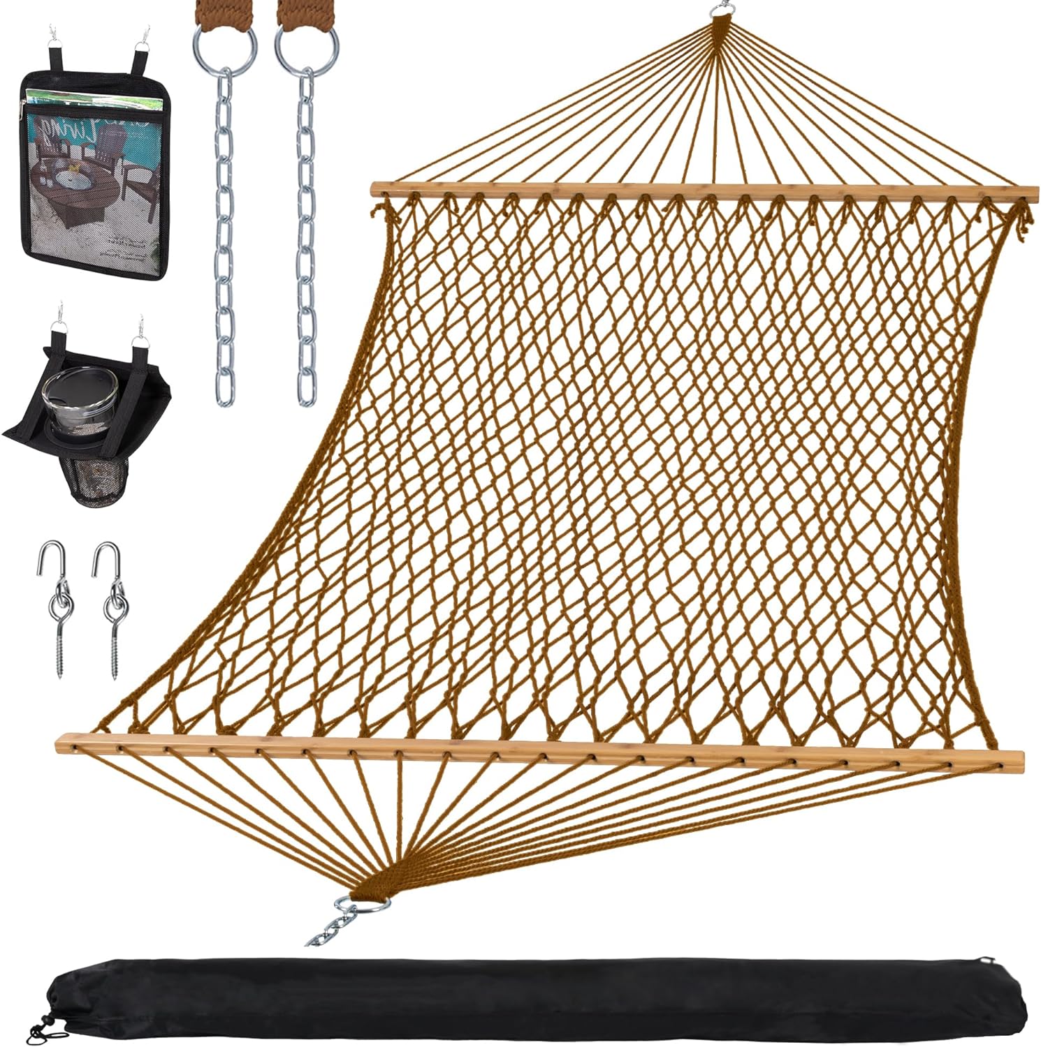 SUNCREAT Portable 2 Person Hammock with Carrying Bag, Tree Hooks, Magazine Bag, Bottle Holder, Heavy Duty Hanging Tree Hammock, Brown