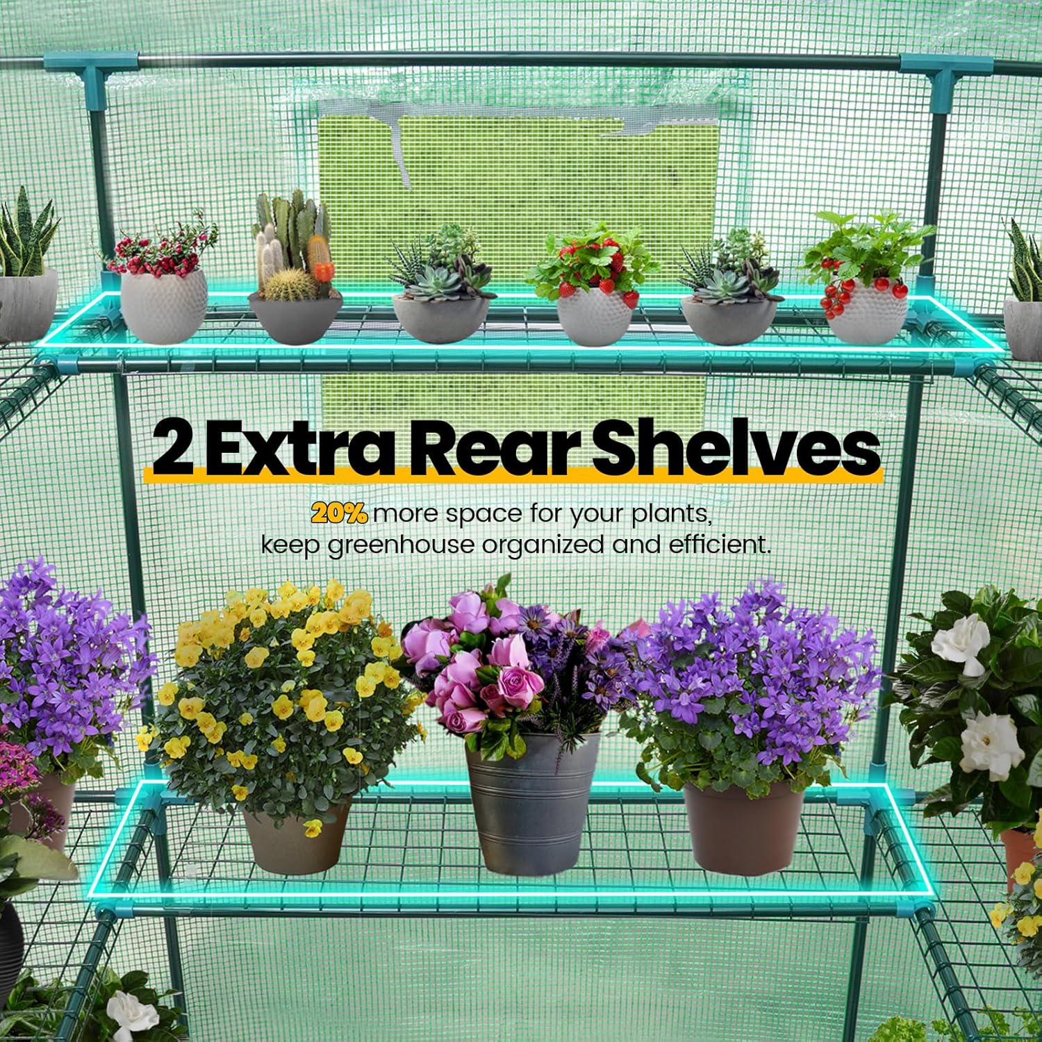 - [More Plants To Place Than Ever] --2 shelves on the back and 18 side shelves of this greenhouse can contain more stuff than normal shelves. Upgraded steel wire shelves, high hardness connectors and powder-coated steel poles make higher load-bearing capacity possible (MAX 46 lbs/shelf, others: 15-20 lbs/shelf).