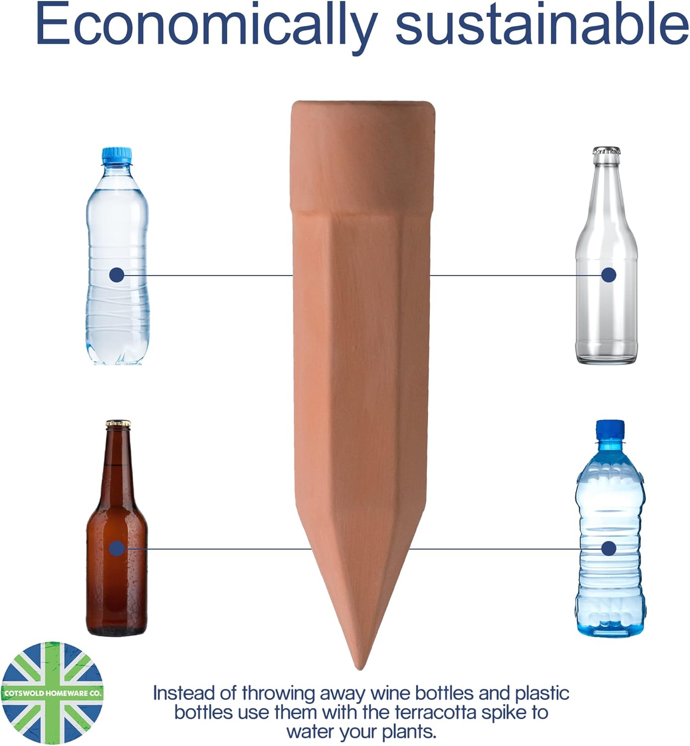 - Economical- Our terracotta plant Watering Stakes include 8 watering stakes and our two way moisture and PH sensor. You can choose used wine bottles or long neck plastic bottles that are compatible with our stakes. The watering spike is a perfect tool for you to recycle the used bottles and free up labor at the same time. Fill the bottle or wine bottle with water, connect the bottle with stakes and turn upside down.