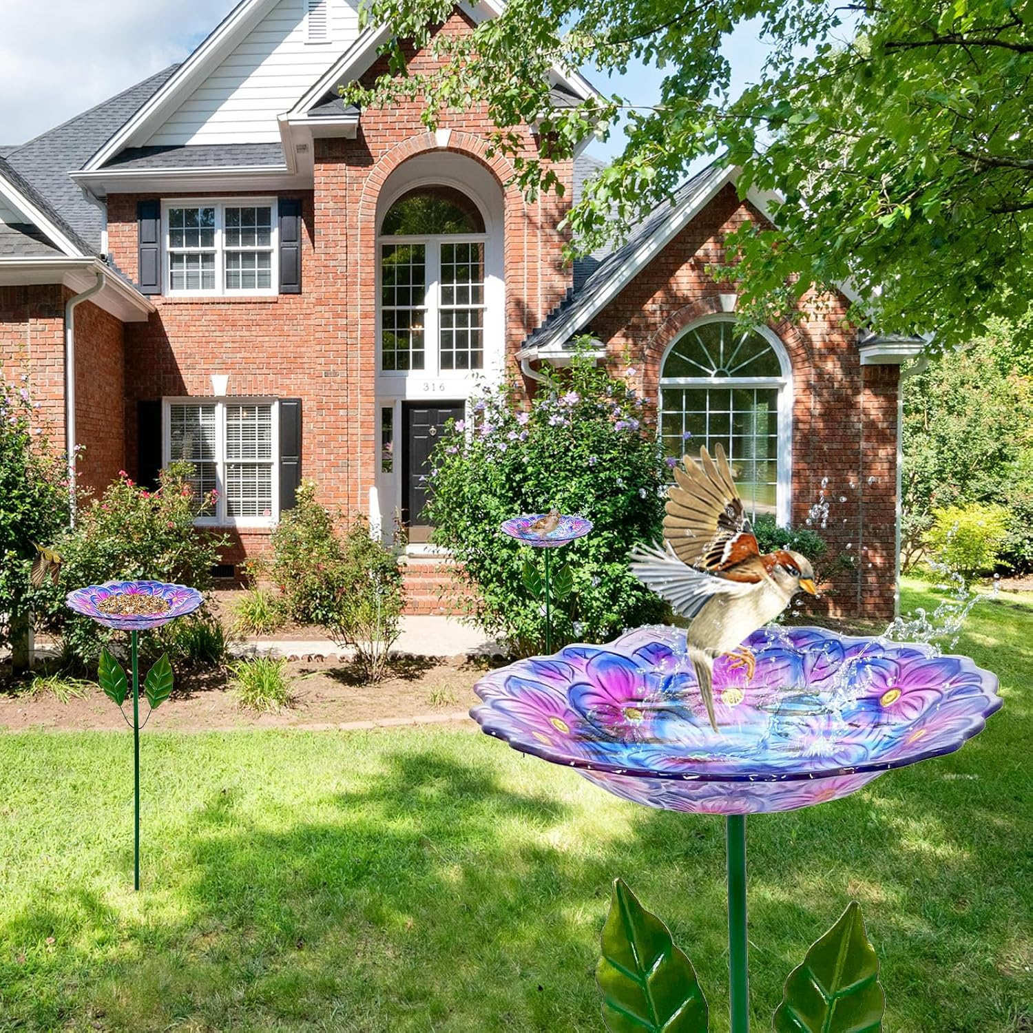 - ✨【Exquisite Bird Bath】It is not only a bird feeders for outdoors, but also a place for birds to take a bath. The colorful flowers glass tray will successfully attract the sight of wild birds for you to watch it up close in your leisure time in yard, garden, balcony, patio, lawn, etc